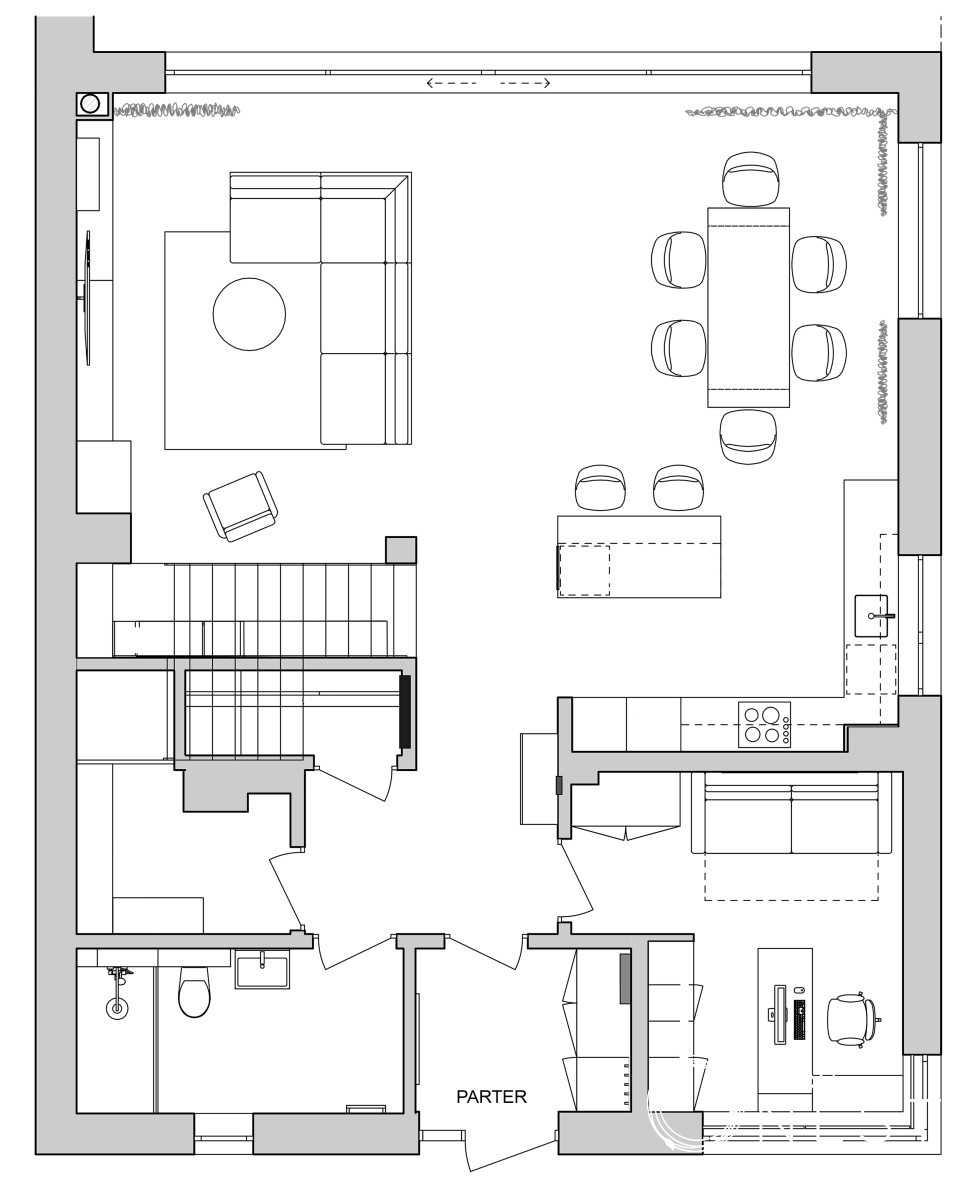Opis parteru: salon z jadalnia z aneksem kuchennym ok 57 m2. Z salonu wyjście na taras ok 14 m2, dodatkowo na parterze gabinet ok 12 m2, łazienka, pomieszczenie gospodarcze, kotłownia, hol, wiatrołap i schody. Wysokość pomieszczeń 3 m.