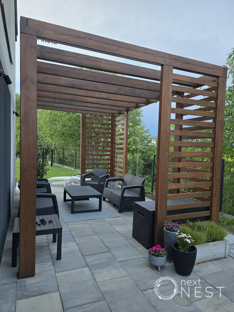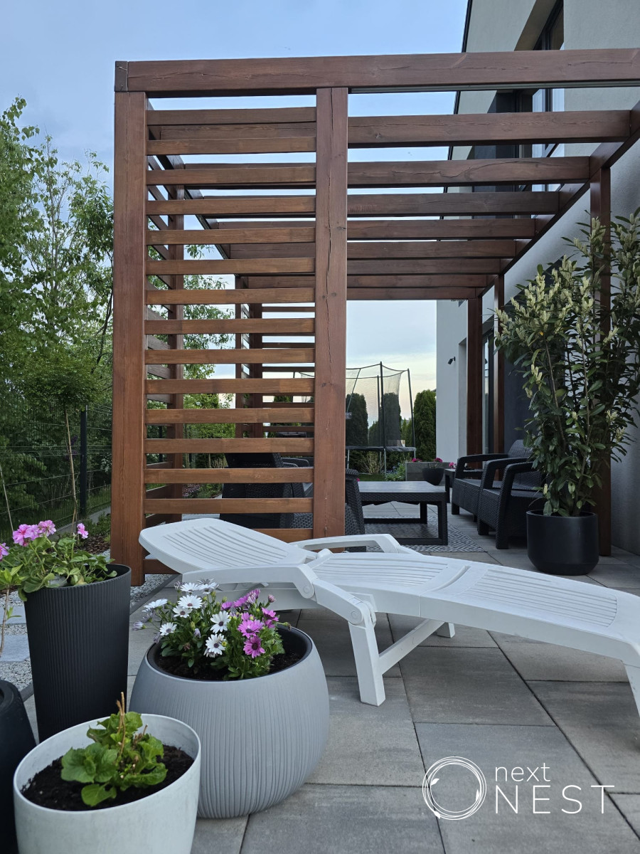 Na działce o powierzchni 500m2 urządzono ogród z systemem nawadniającym oraz miejsce do wypoczynku - pergolę z meblami ogrodowymi.