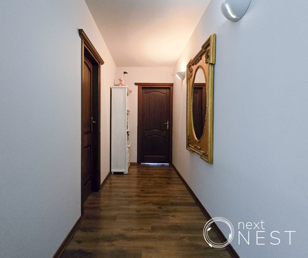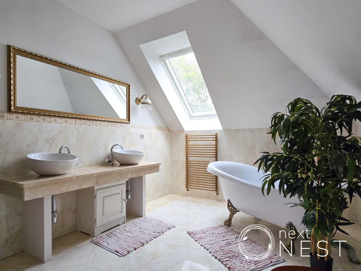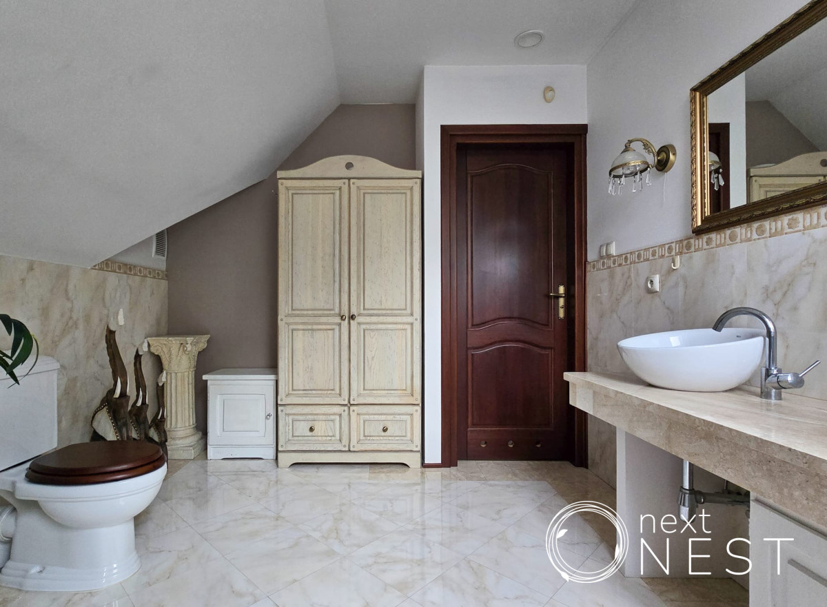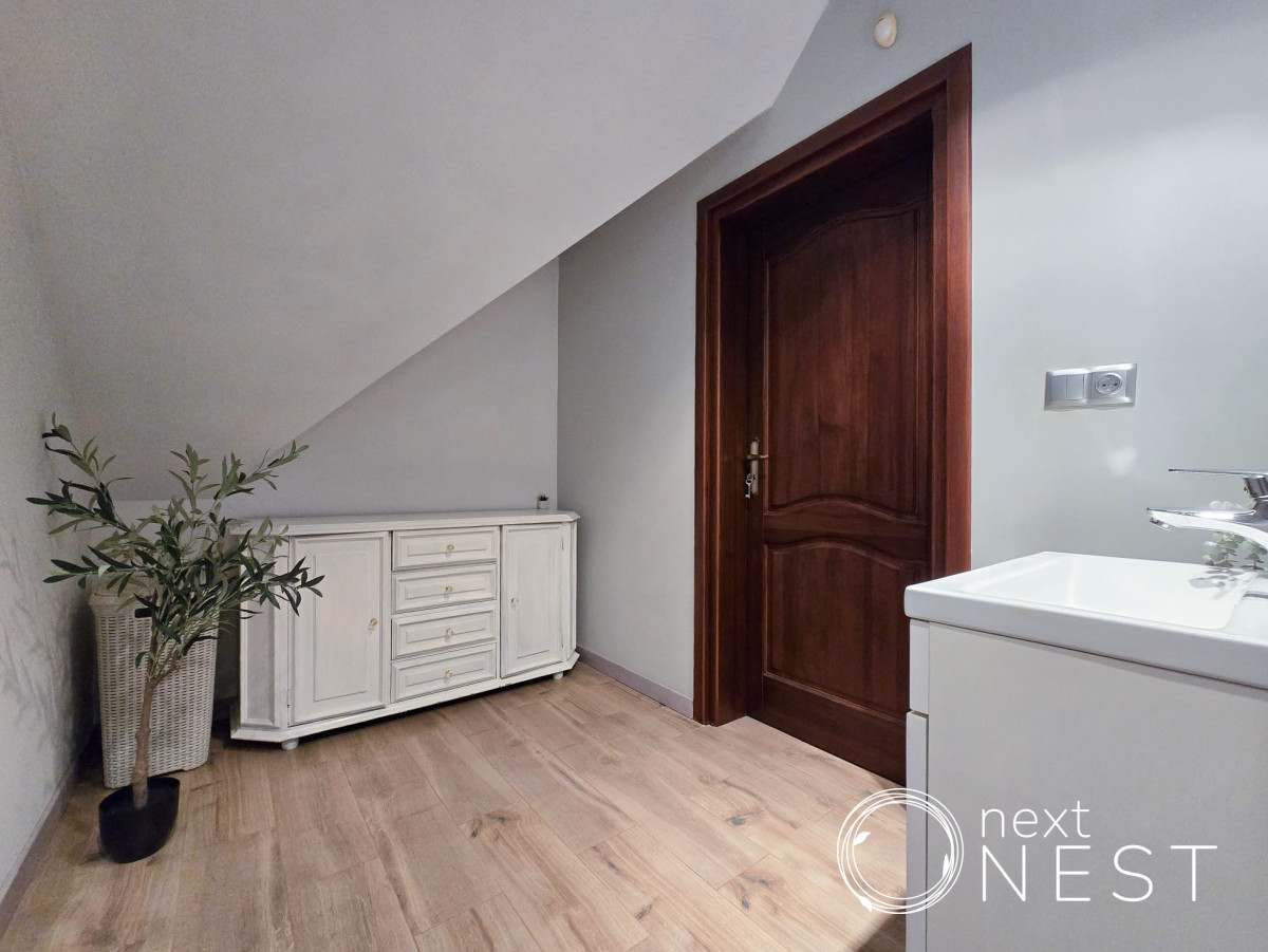 - Piętro: trzy sypialnie, pokój kąpielowy, łazienka z pralnią, 2 garderoby.
