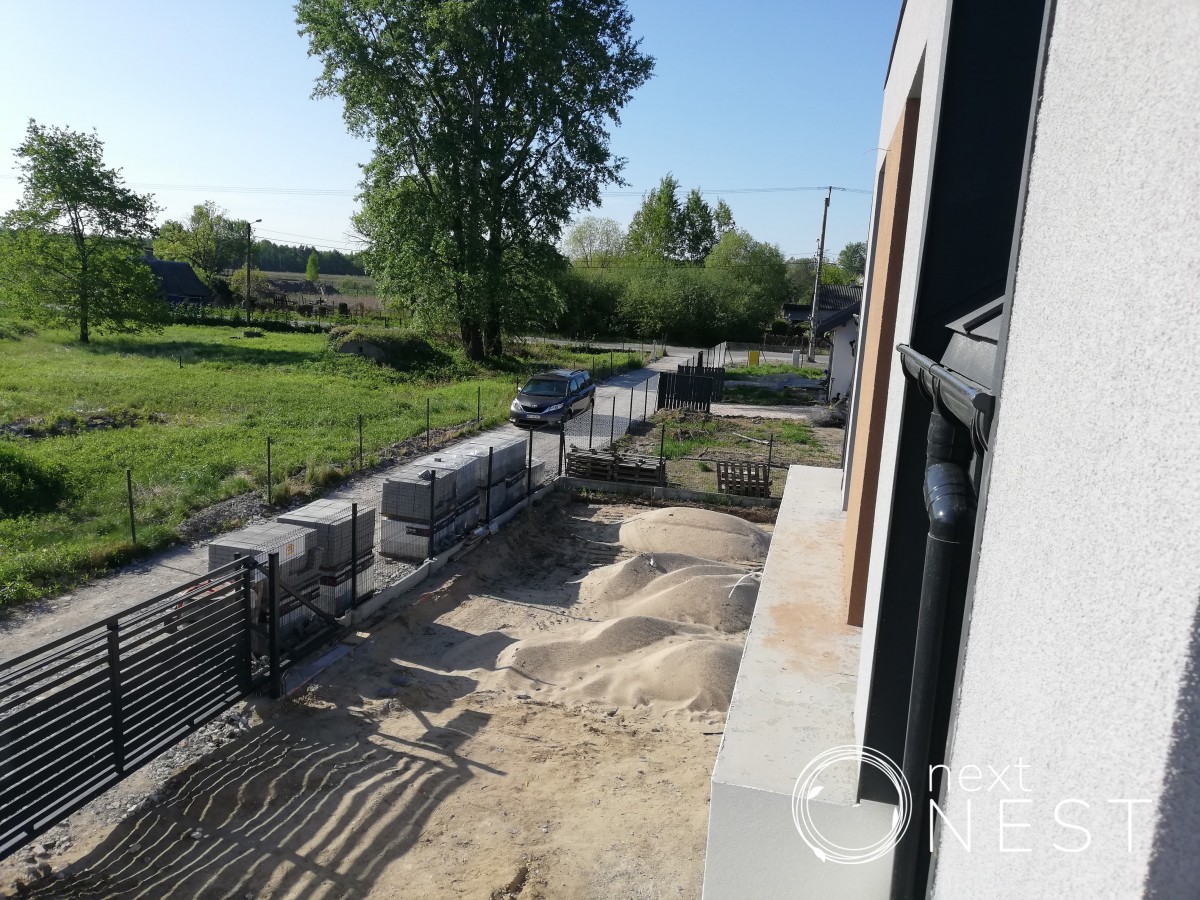 Dom posiadać będzie ogrodzenie panelowe, brama przesuwna, furtka podjazdy i tarasy są utwardzone kostką, teren obsiany będzie trawą.