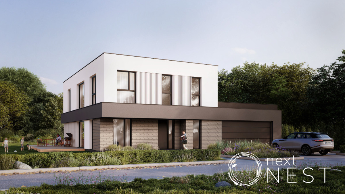 - elementy dekoracyjne elewacji z cegły elewacyjnej oraz lameli ryflowanych
