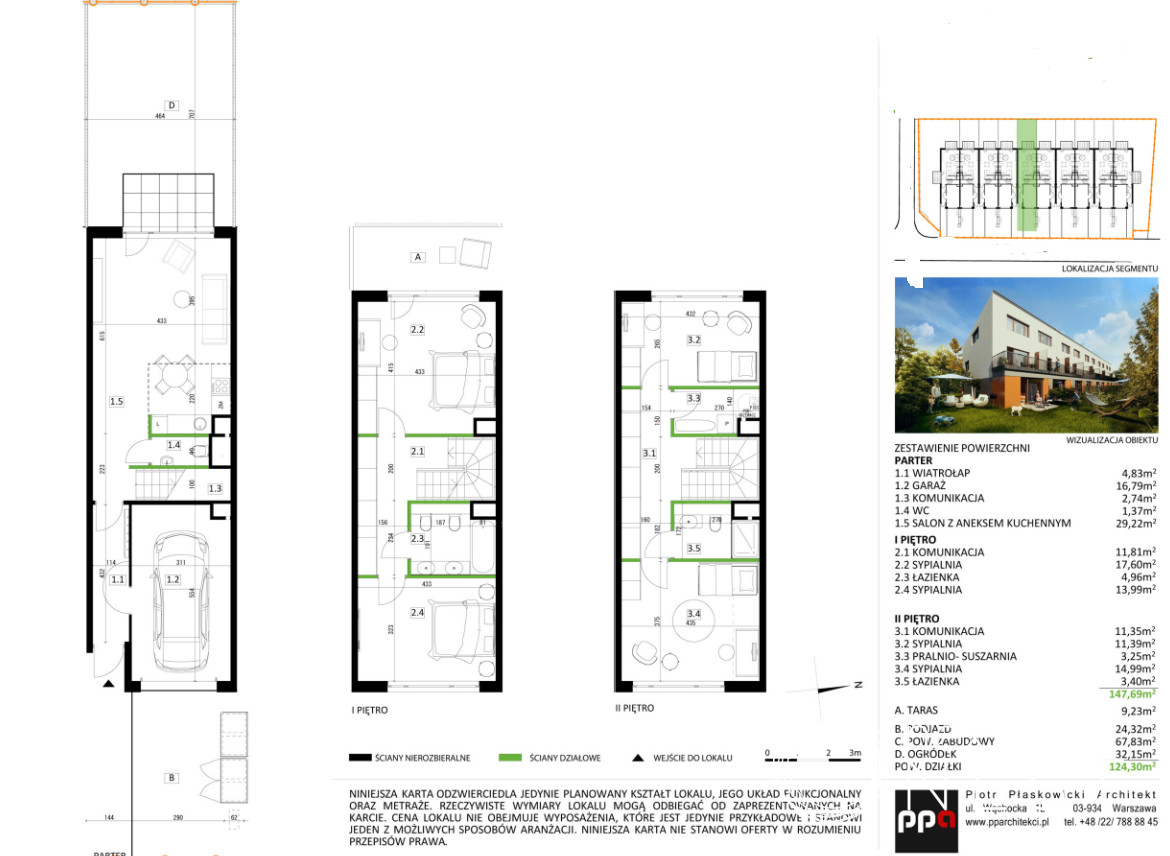 Segment składa się z salonu z aneksem kuchennym, łazienki i garażu na parterze oraz 4 sypialni/gabinetów i 2 łazienek na dwóch piętrach.