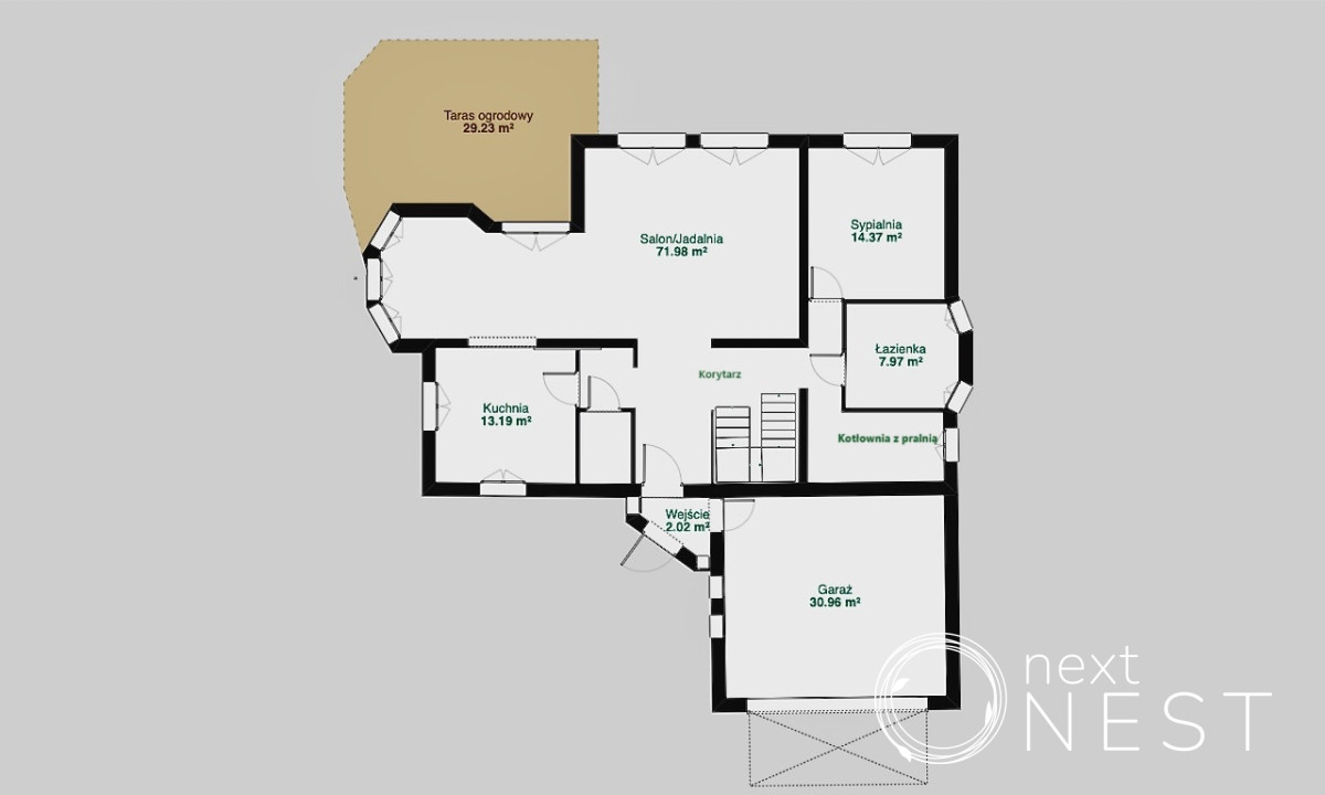 Parter: salon z jadalnią i wyjściem na taras, kuchnia, toaleta, łazienka z wanną i prysznicem, gabinet/pokój gościnny, kotłownia, przedsionek oraz garaż.
