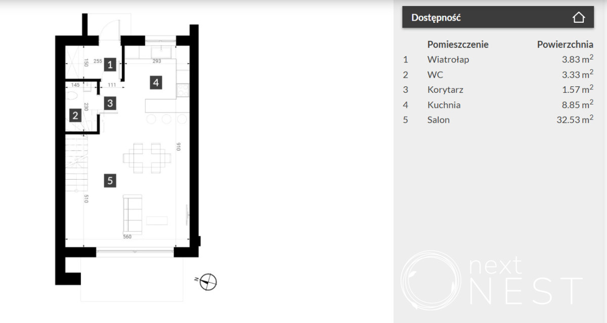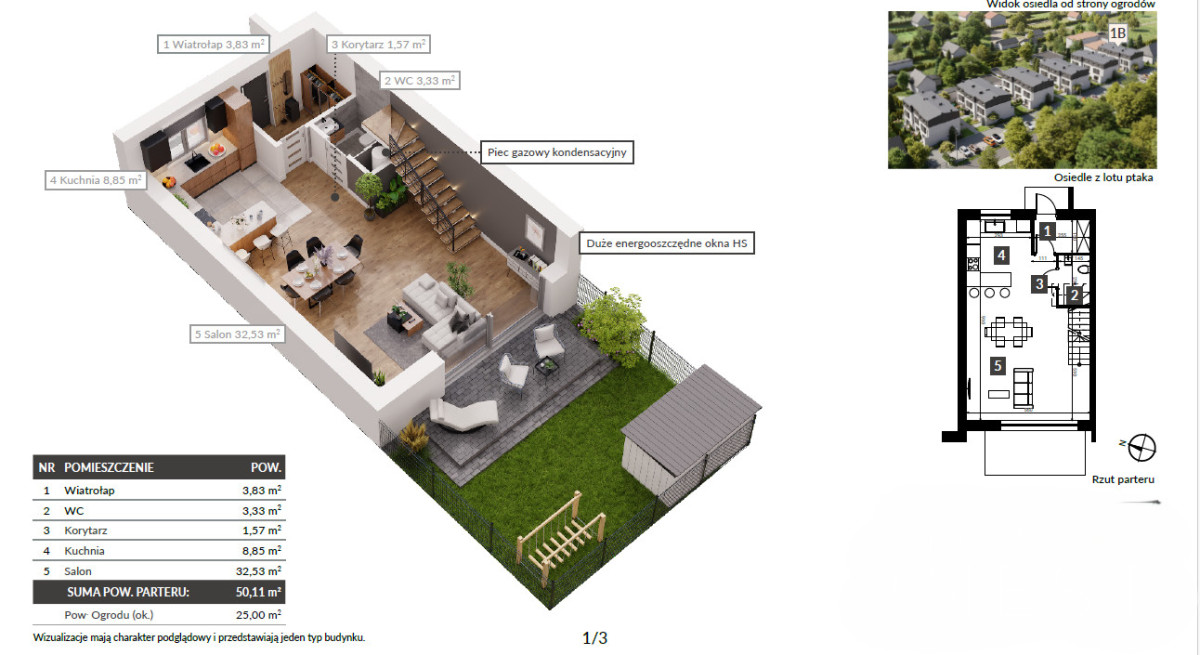 - Parter: przestronny salon z aneksem kuchennym, łazienka, wiatrołap