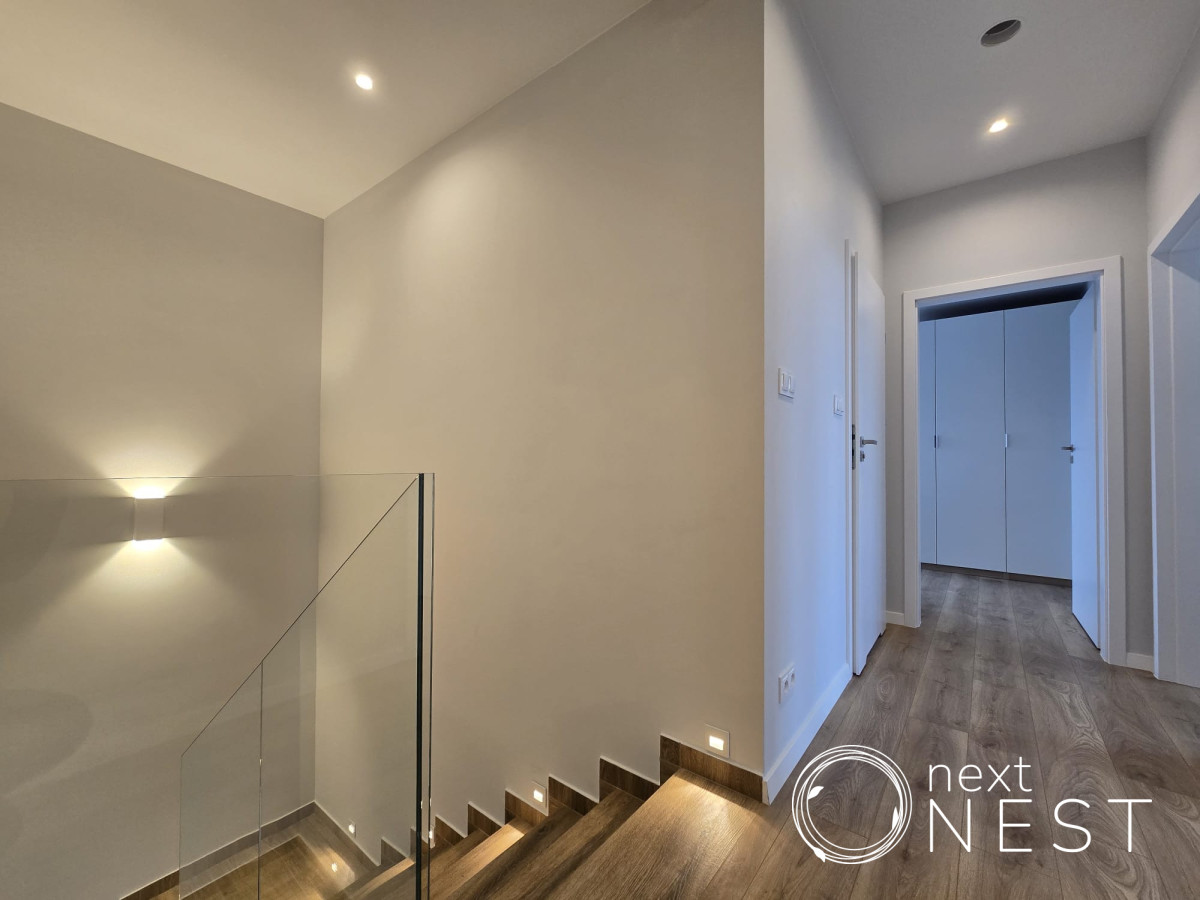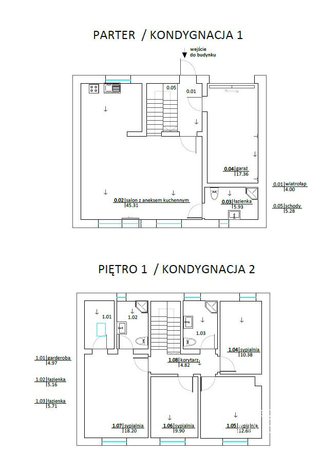 - piętro: 4 sypialnie w tym jedna z łazienką i garderobą, druga łazienka oraz korytarz.