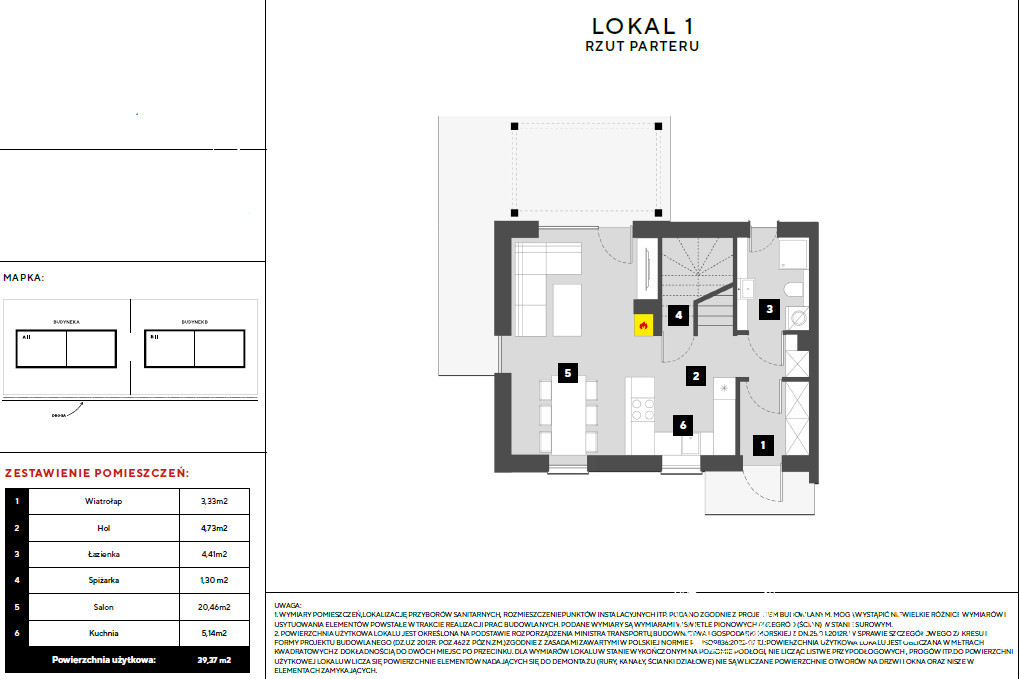 - parter: salon z aneksem kuchennym, łazienka, spiżarka, wiatrołap, korytarz,