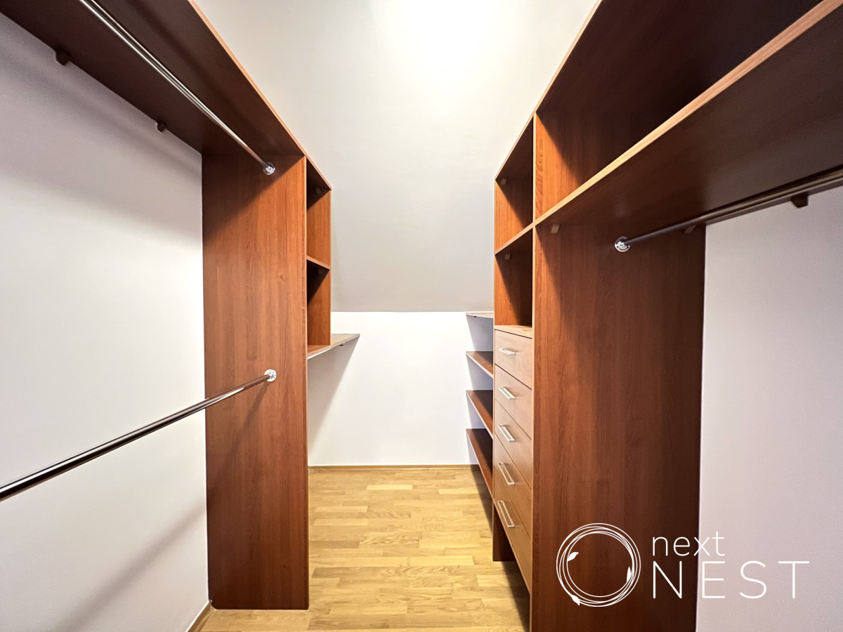 Na parterze znajdują się: salon z jadalnią i wyjściem na taras, kuchnia, spiżarnia/pralnia, łazienka z prysznicem, przedpokój, garderoba i gabinet zaaranżowany z garażu. Na piętrze znajdują się: cztery sypialnie, garderoba i duża łazienka z wanną. Dom jest umeblowany. Na podłogach deska drewniana oraz gres.