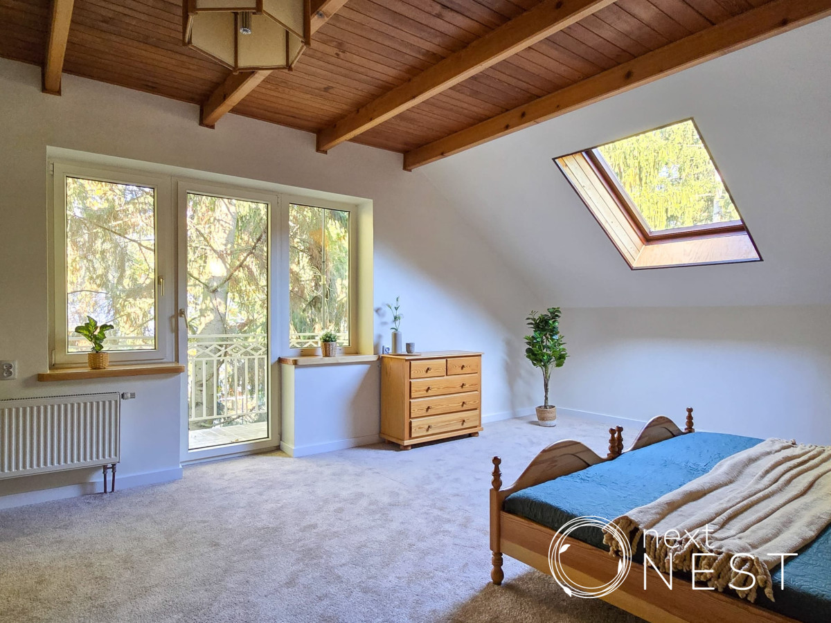 Na piętrze są dwie sypialnie z dużymi garderobami oraz wyjściem na balkon, pokój kąpielowy z prysznicem i wanną z jacuzzi.