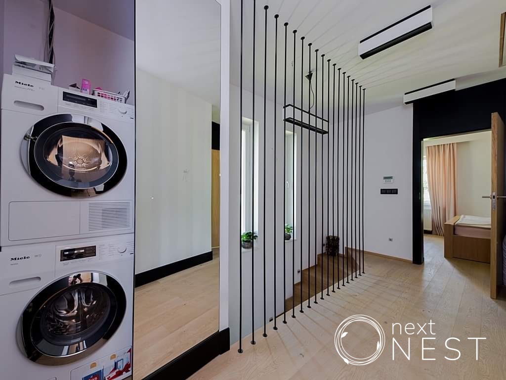Na piętrze znajdują się: dwie sypialnie, w tym jedna z garderobą, gabinet, pralnia oraz łazienka.