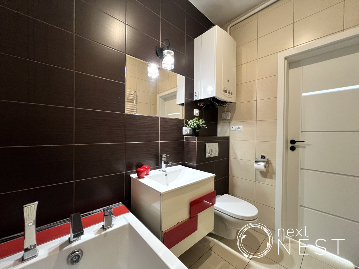 Mieszkanie składa się z salonu z aneksem kuchennym, dwóch sypialni, łązienki, wc z pralką i przedpokoju. W łazience dodatkowo ogrzewanie podłogowe. Z salonu wyjście na balkon i zejście do ogrodu. Ekspozycja balkonu i ogrodu: południowo - zachodnia.