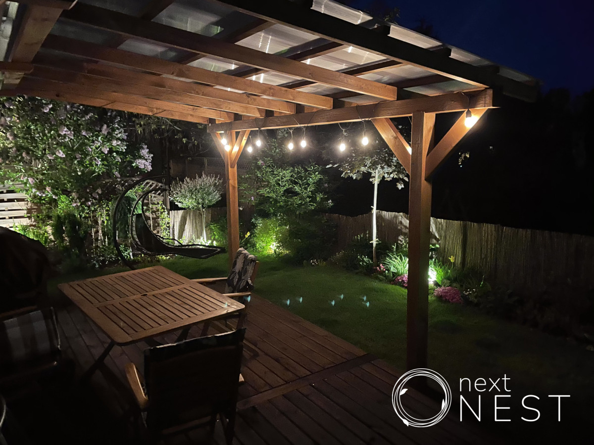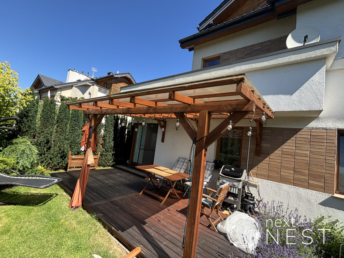 W ogrodzie zadaszony taras o powierzchni 18 m2. W zeszłym roku wymienione zostało zadaszenie tarasu (poliwęglan z UV). Ogród urządzony z rozprowadzonym automatycznym nawodnieniem oraz oświetleniem.