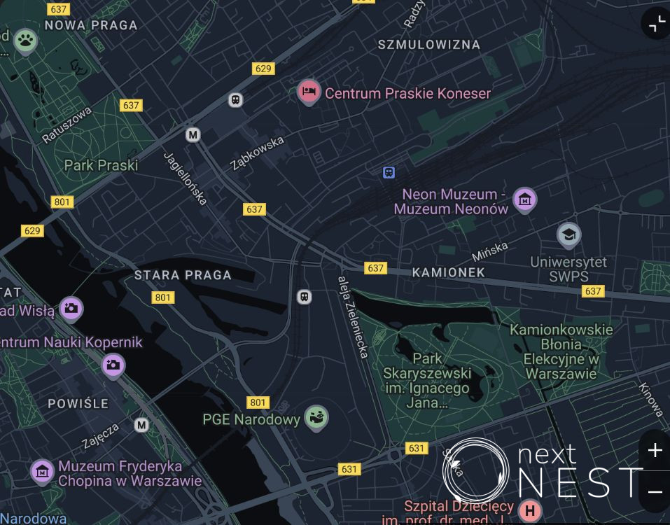 - przystanki: autobusowy, tramwajowy, metro Stadion Narodowy,