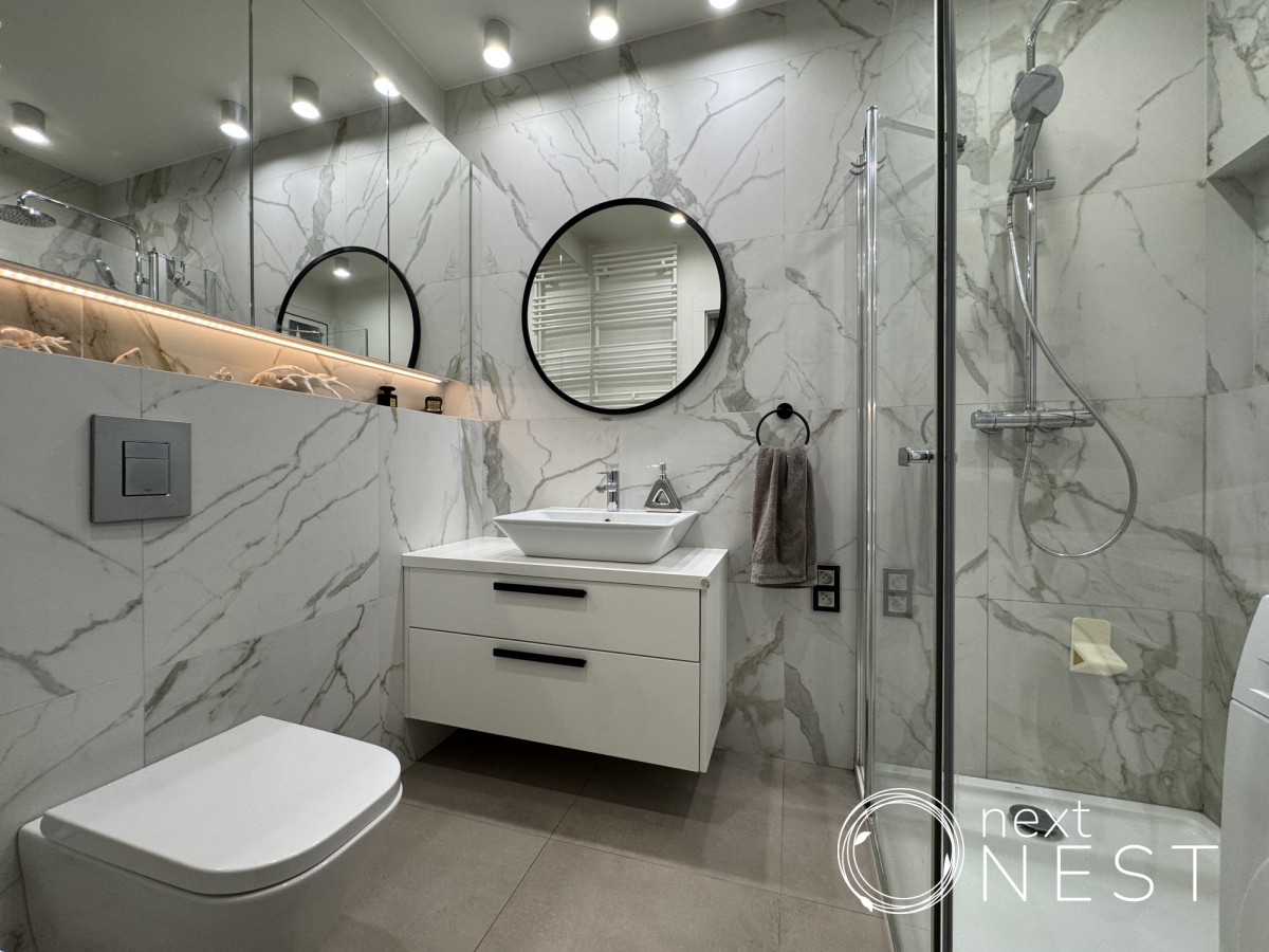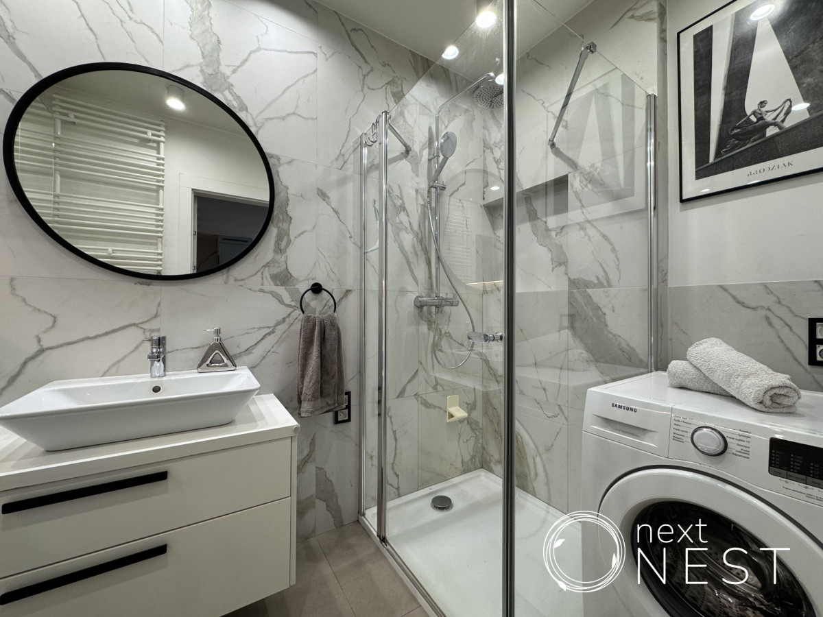 - łazienka (wyposażona w pralkę, szafę w zabudowie, prysznic i wysokiej klasy armaturę),