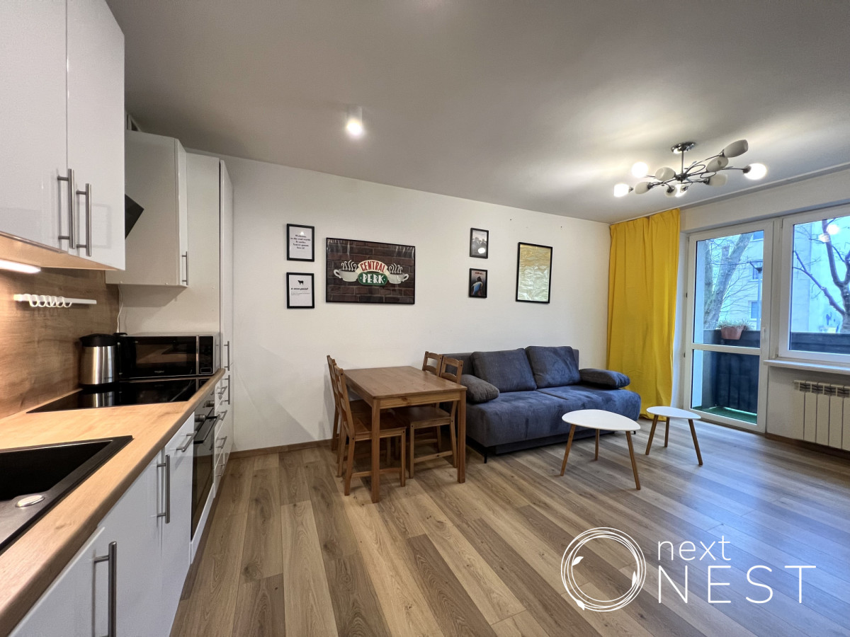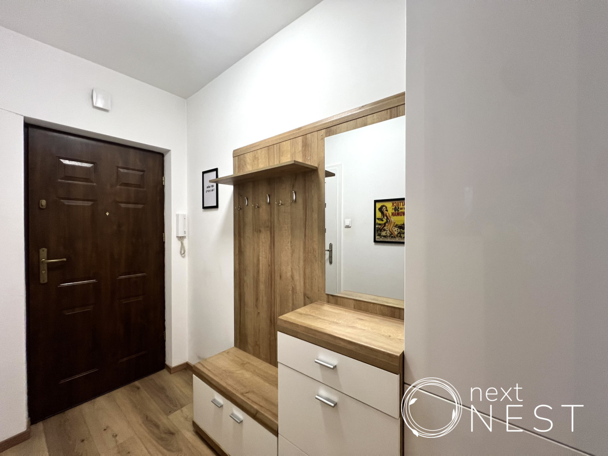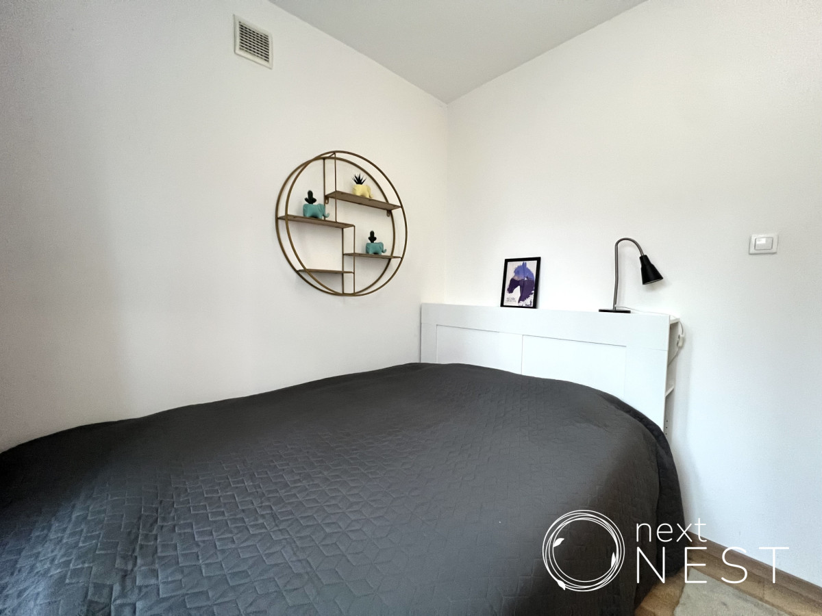 Wyposażenie oferowane w cenie najmu: meble, w tym podwójne łóżko w sypialni z nowym materacem oraz nowa, rozkładana kanapa w salonie, zabudowa kuchenna, sprzęt AGD (lodówka, płyta indukcyjna, piekarnik, zmywarka, mikrofala, czajnik, pralka).