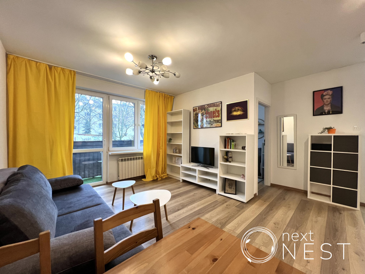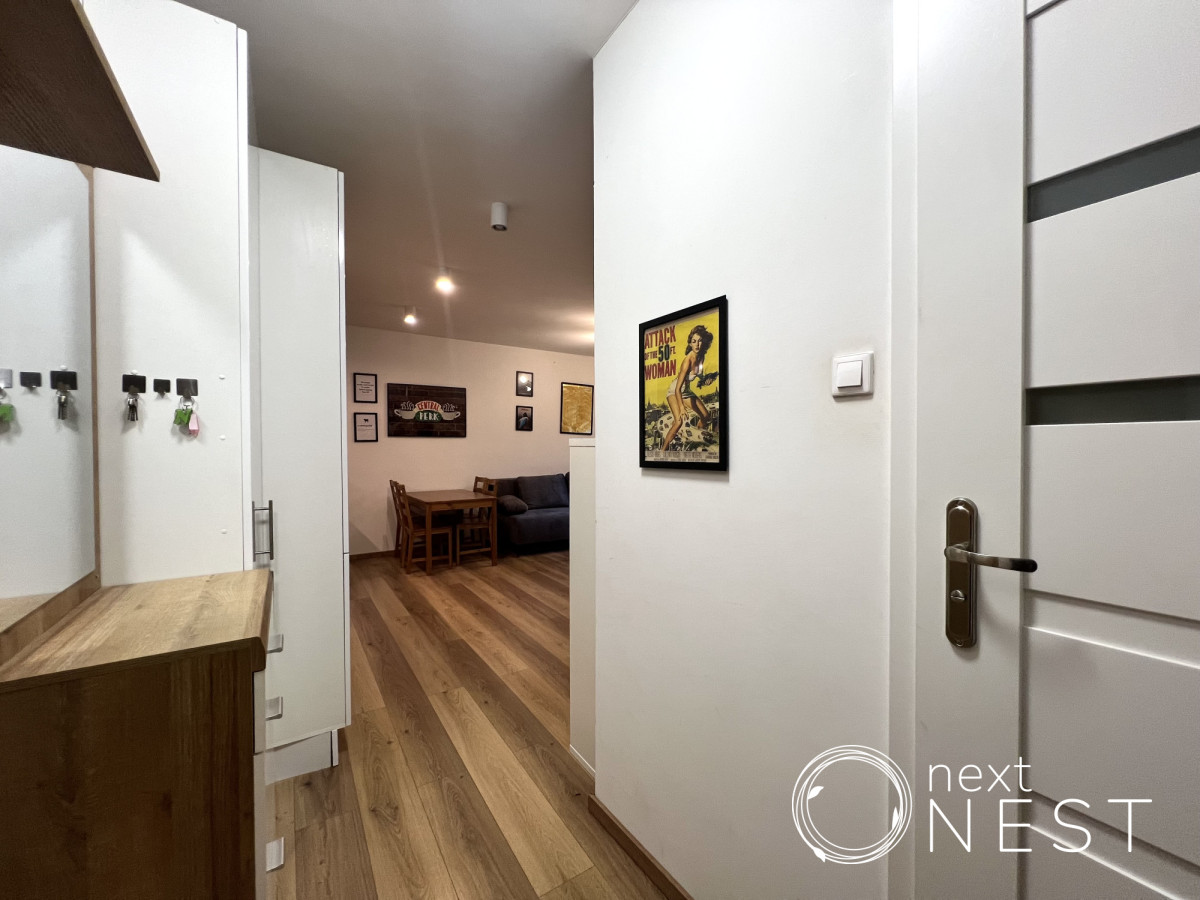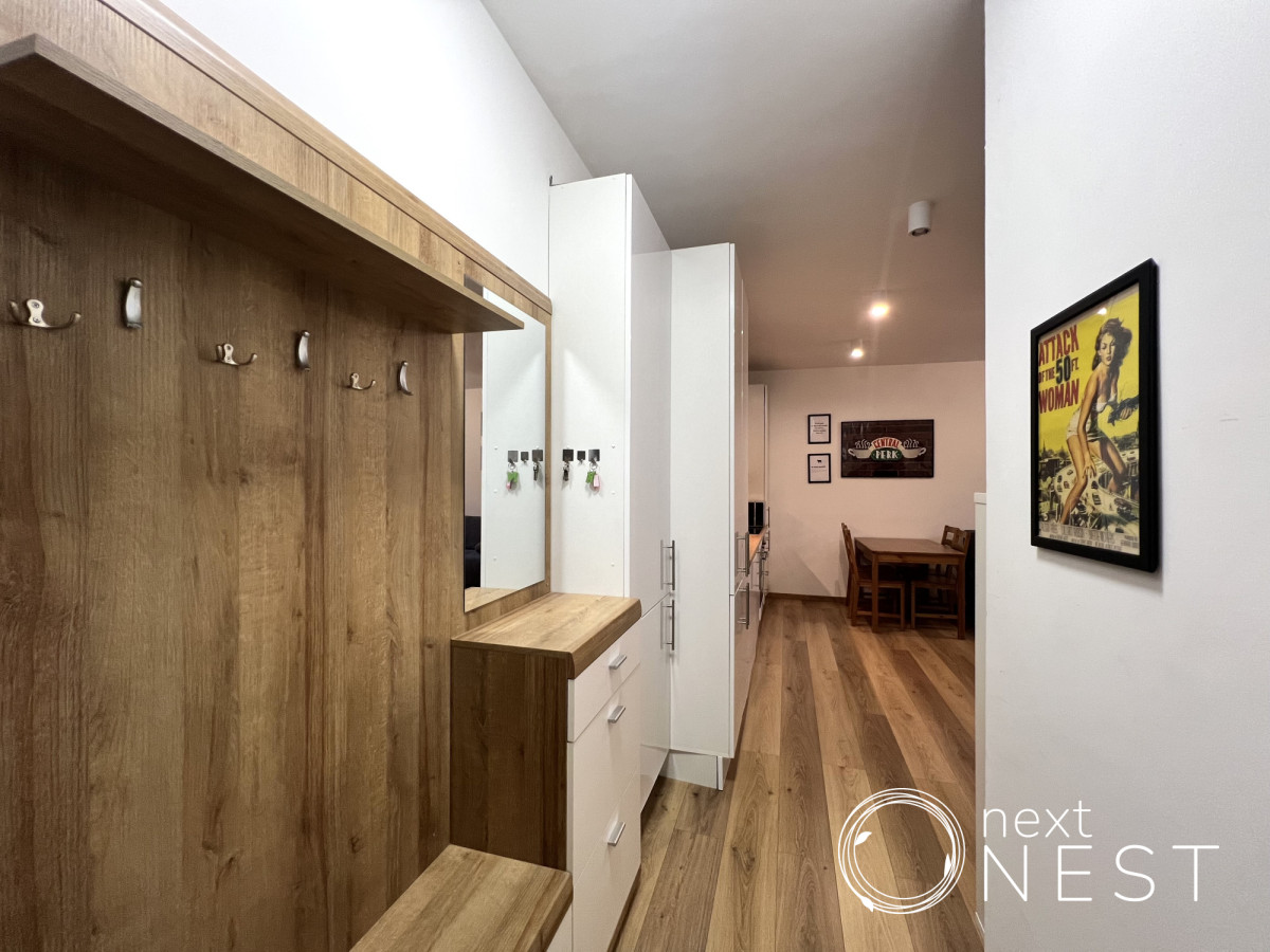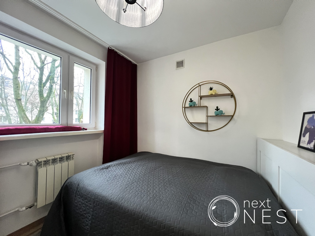 Wyposażenie oferowane w cenie najmu: meble, w tym podwójne łóżko w sypialni z nowym materacem oraz nowa, rozkładana kanapa w salonie, zabudowa kuchenna, sprzęt AGD (lodówka, płyta indukcyjna, piekarnik, zmywarka, mikrofala, czajnik, pralka).