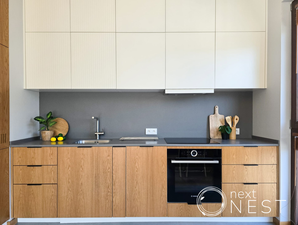 W pełni wyposażona kuchnia (lodówka, kuchenka, zmywarka), w kuchni zamontowano również pralkę i suszarkę,