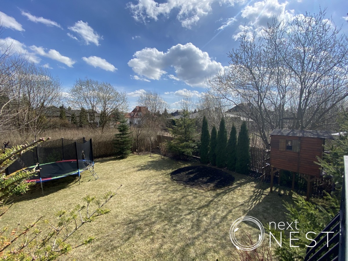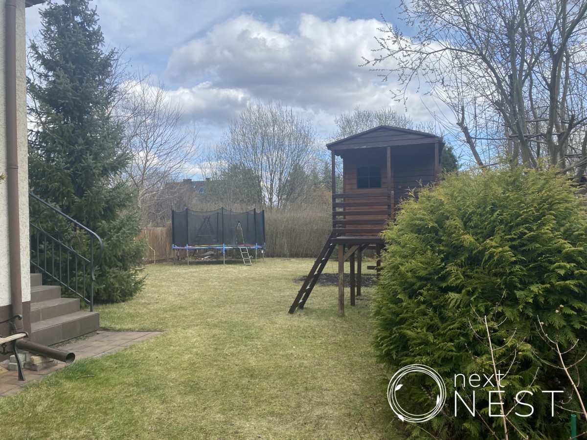 Pięknie zagospodarowany ogród, w którym znajdziemy także drewniany domek dla dzieci.