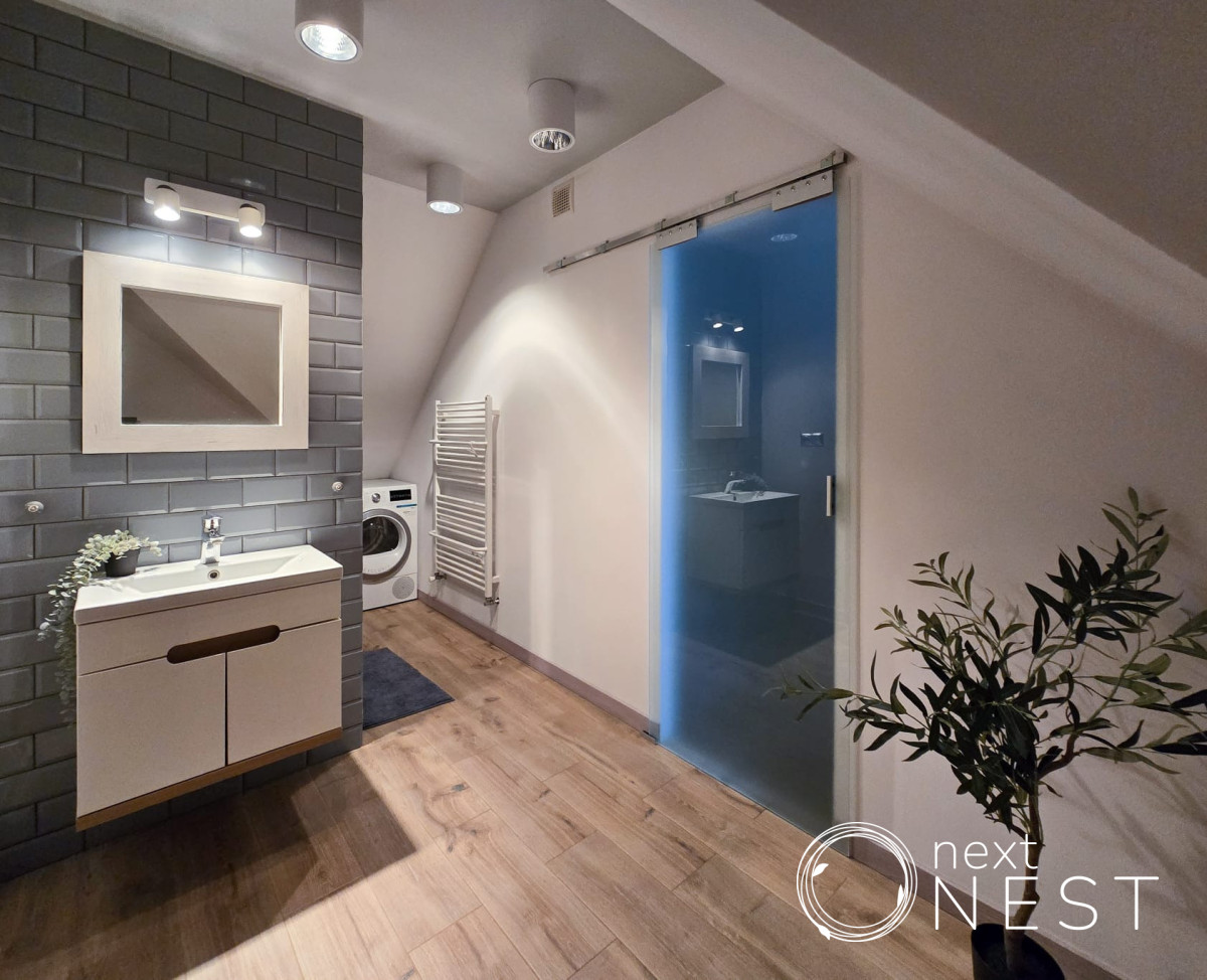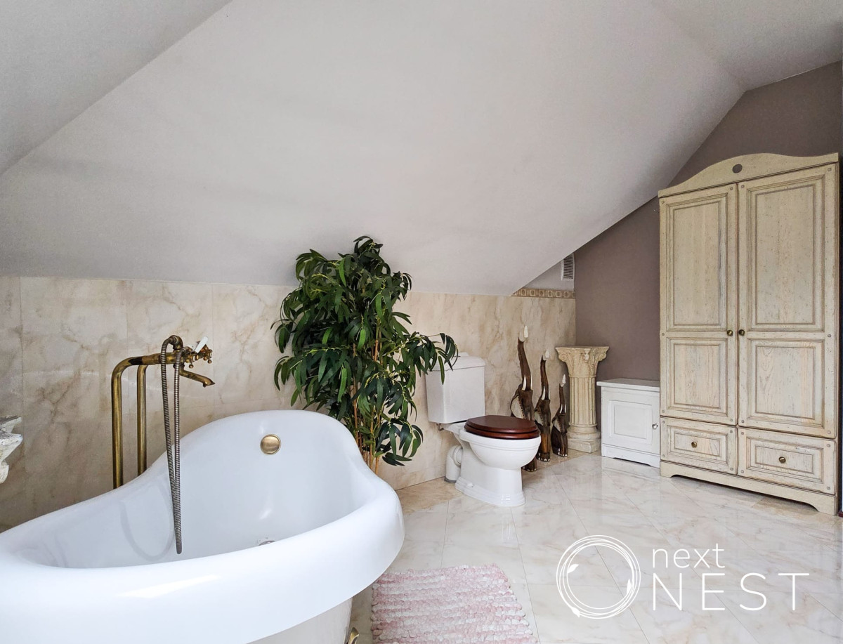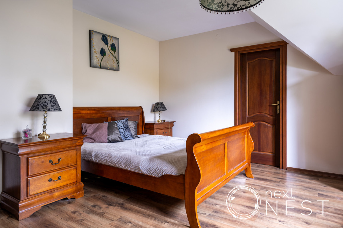 - Piętro: trzy sypialnie, pokój kąpielowy, łazienka z pralnią, 2 garderoby.