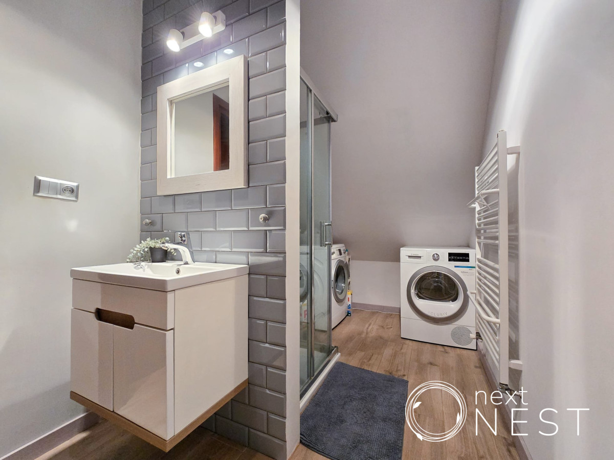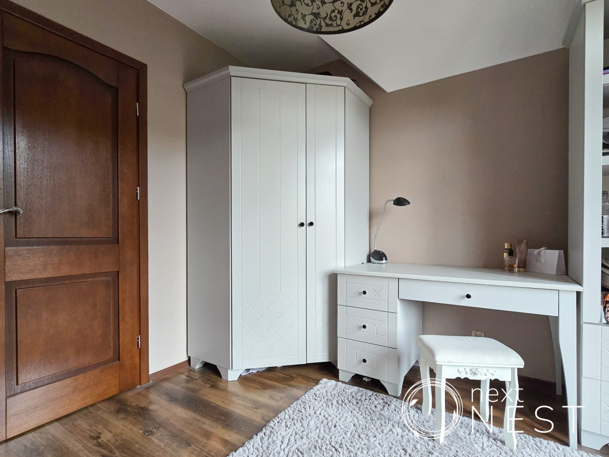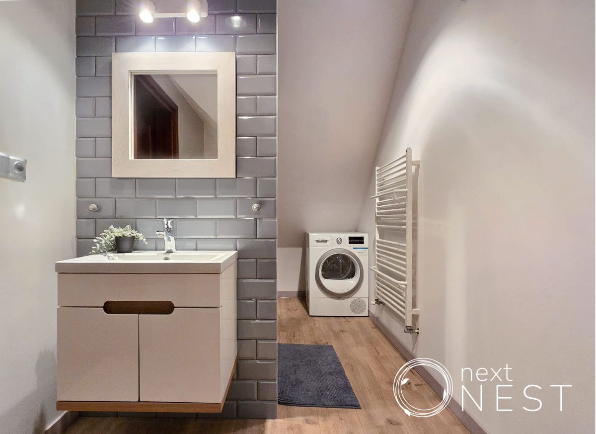 - Piętro: trzy sypialnie, pokój kąpielowy, łazienka z pralnią, 2 garderoby.