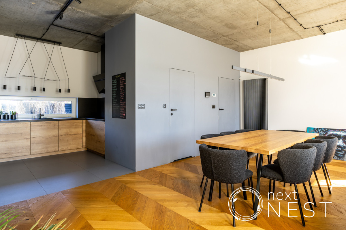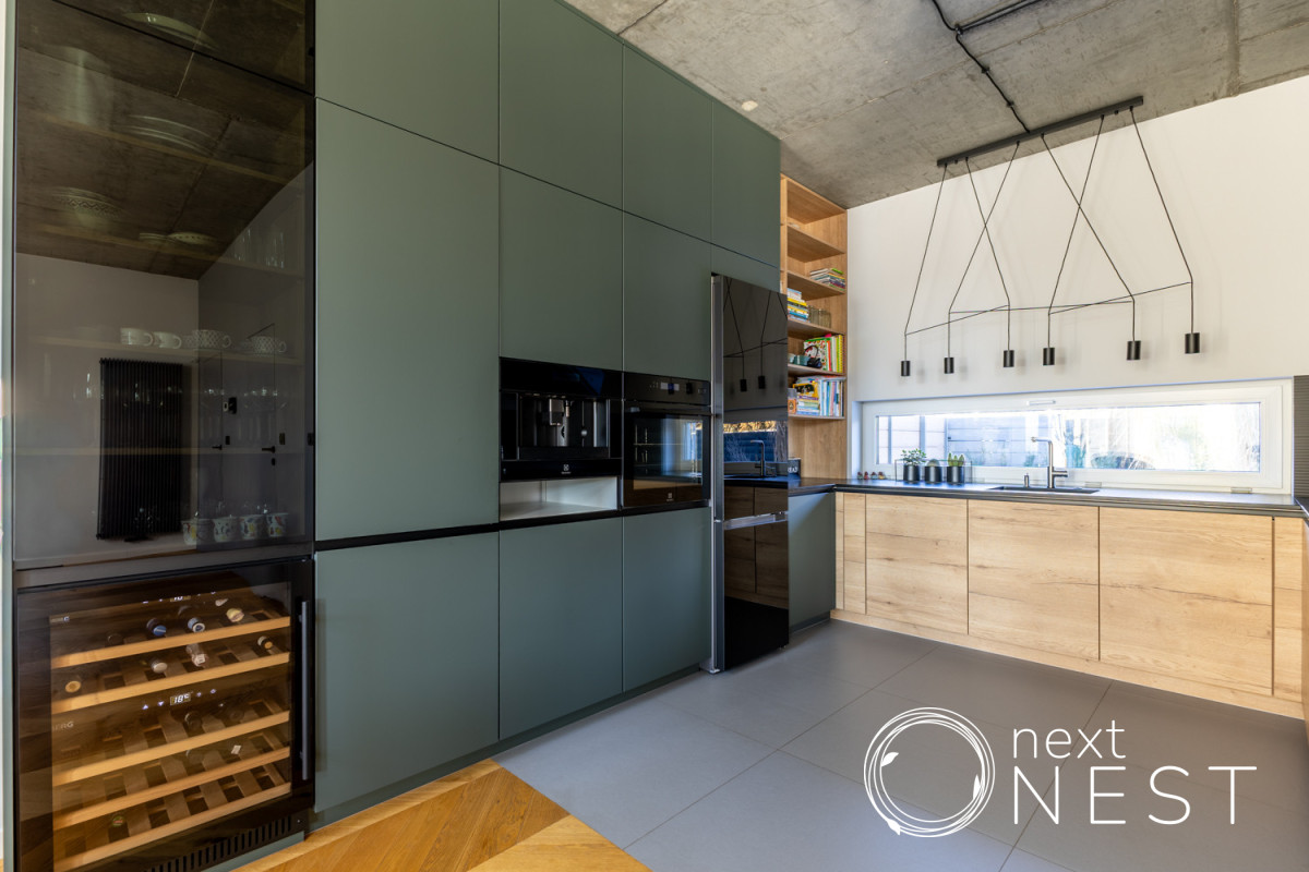 Dom został wykończony z dbałością o każdy detal, z wykorzystaniem materiałów wysokiej klasy. Kuchnia firmy VERLE, blat granit NERO ZIMBABWE, wyposażona w sprzęty AGD: lodówkę, piekarnik, ekspres do kawy, płytę grzewczą oraz młynek do odpadów zamontowany w zlewie. Podłoga z deski dębowej olejowanej.