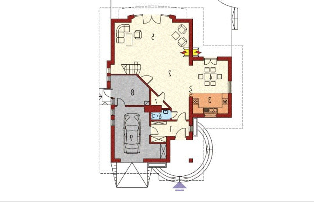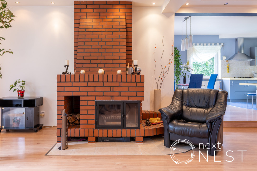 Kuchnia z jadalnią otwarta na salon z kominkiem, łazienka z prysznicem, hall z dużą szafą wnękową, garaż jednostanowiskowy z pomieszczeniem gospodarczym i kotłownią - kocioł gazowy Viessmann.