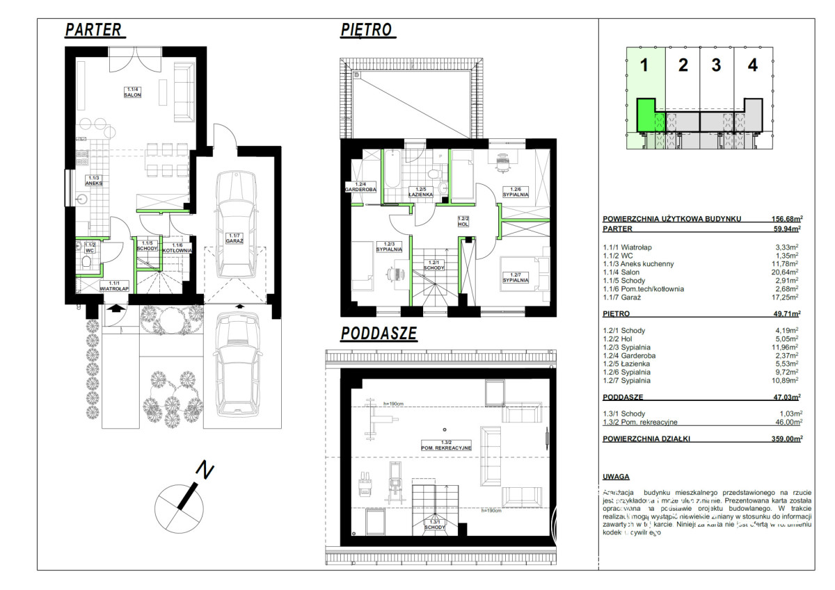 segment SKRAJNY o powierzchni użytkowej 156,68 m2, na działce o powierzchni około 359 m2 z garażem jednostanowiskowym.