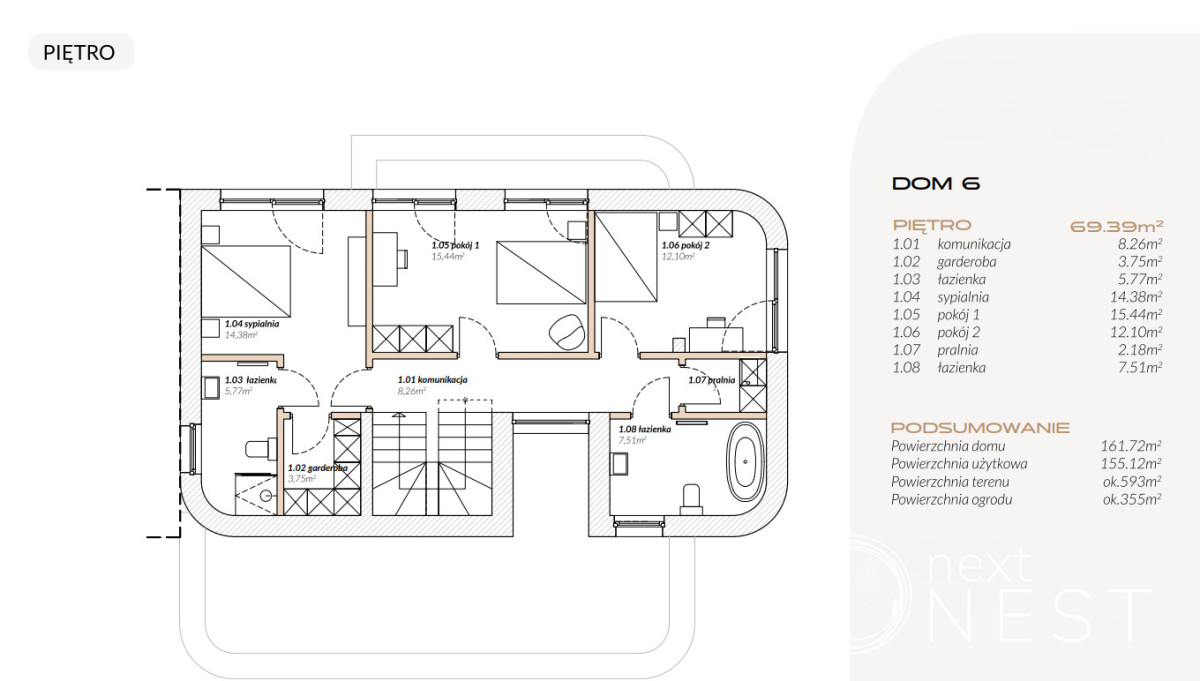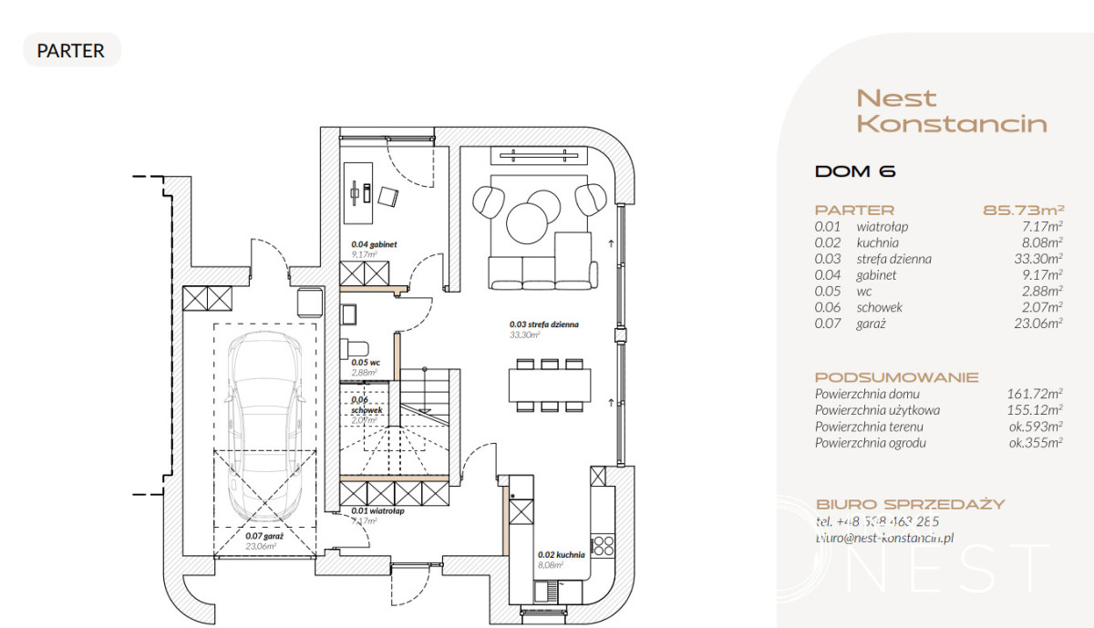 Przedmiotem sprzedaży jest dom w zabudowie bliźniaczej o powierzchni 161,72 m2 z garażem w bryle budynku. Nieruchomość posadowiona jest na działce o powierzchni 593 m2.