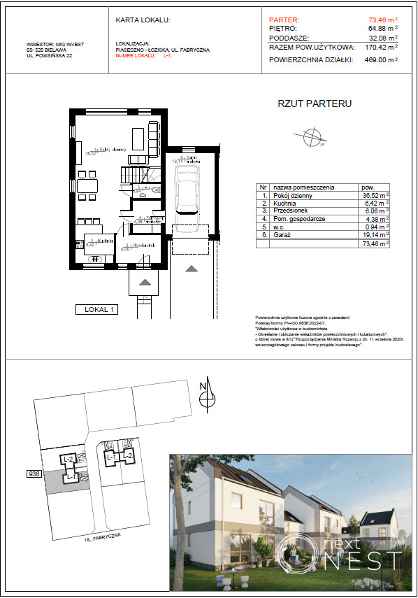 Przedmiotem sprzedaży jest lokal w budynku jednorodzinnym dwulokalowym o powierzchni użytkowej 170,42 m2. Nieruchomość posadowiona będzie na działce o powierzchni 902 m2 - po 450 m2 na każdy lokal.