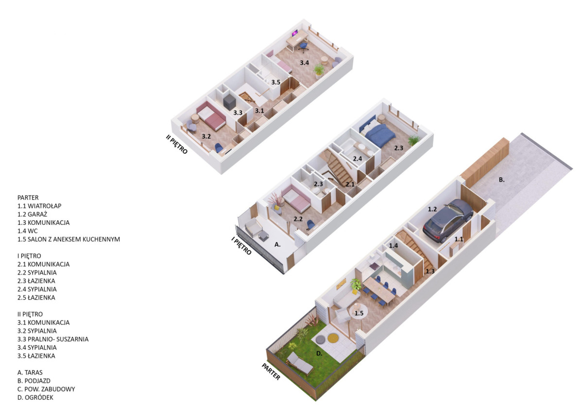 Segment składa się z salonu z aneksem kuchennym, łazienki i garażu na parterze oraz 4 sypialni/gabinetów i 2 łazienek na dwóch piętrach.