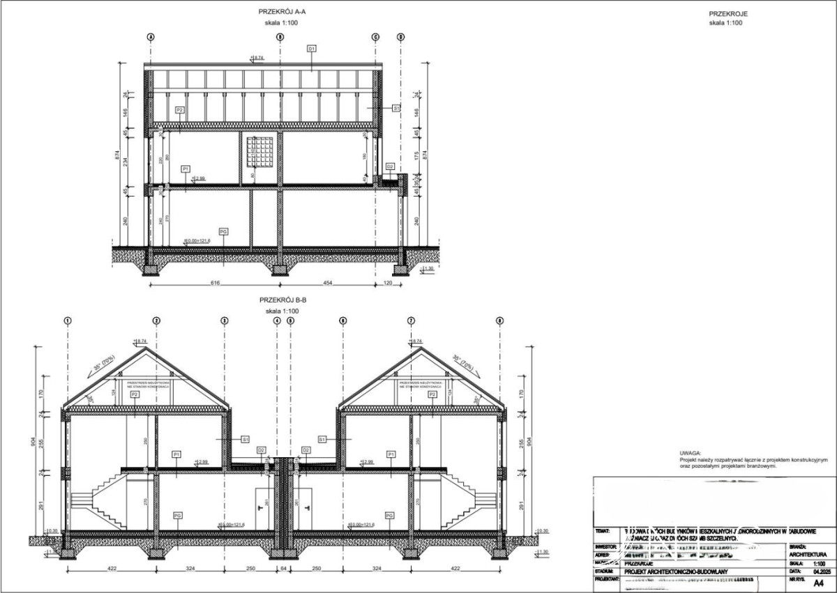 Konstrukcja zostanie wykona z pustaków 24 cm Porotherm, ocieplenie: styropian gr. 20cm. Elewacje będą połączeniem jasnej i ciemnej tonacji, wybrane elementy wykończone panelami elewacyjnymi (np. Ceresit Decor Panel) lub tynkiem odciskanym (np. BOLIX Panel Wood). Wszystkie pomieszczenia będą doskonale doświetlone dzięki dużym przeszkleniom, okna 3-szybowe PCV dwukolorowe: w kolorze białym na powierzchniach wewnętrznych, w kolorze szarym antracytowym/brązowym na powierzchniach zewnętrznych. Domy będą ogrzewane pompami ciepła z ogrzewaniem podłogowym, wyposażone w instalację rekuperacji, kanał pod fotowoltaikę oraz orurowanie dla instalacji klimatyzacyjnej pod niezależny dla każdego domu system klimatyzacji.