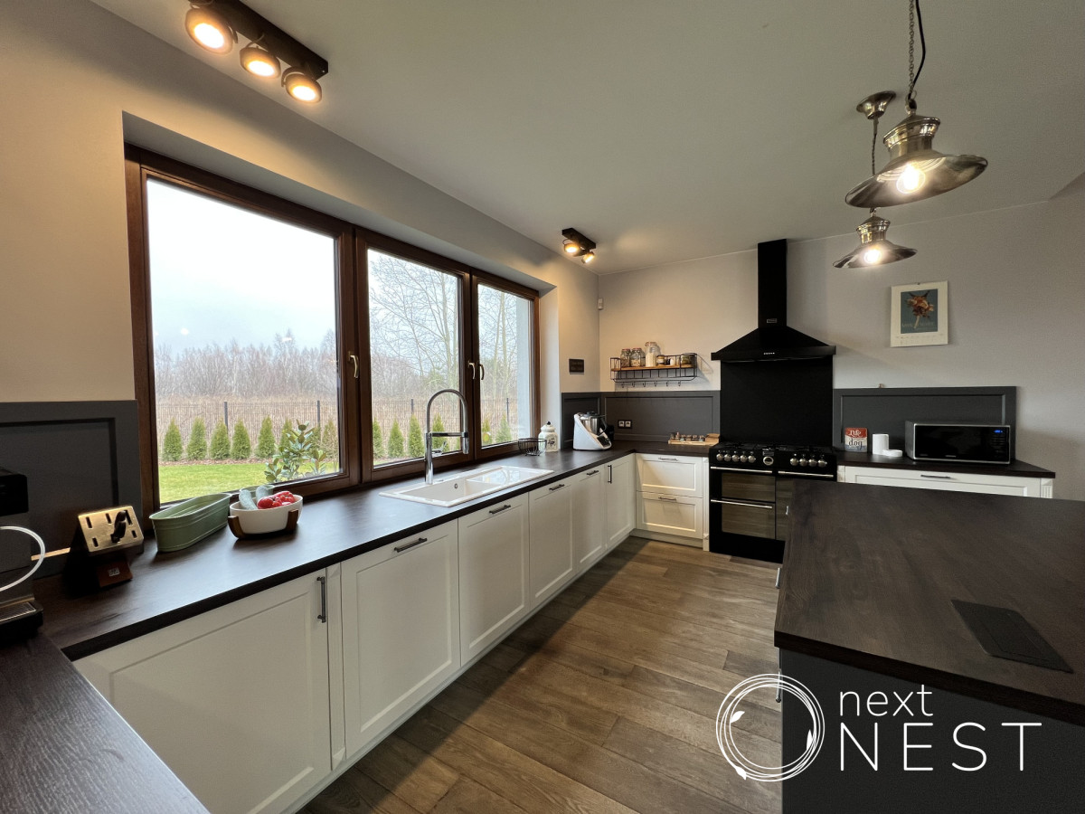 Dom wybudowany metodą tradycyjną - porotherm 25 cm. Okna drewniane z drewna meranti - firmy CDM. Drzwi wejściowe aluminiowe firmy Hormann. Brama garażowa Hormann z automatyką.