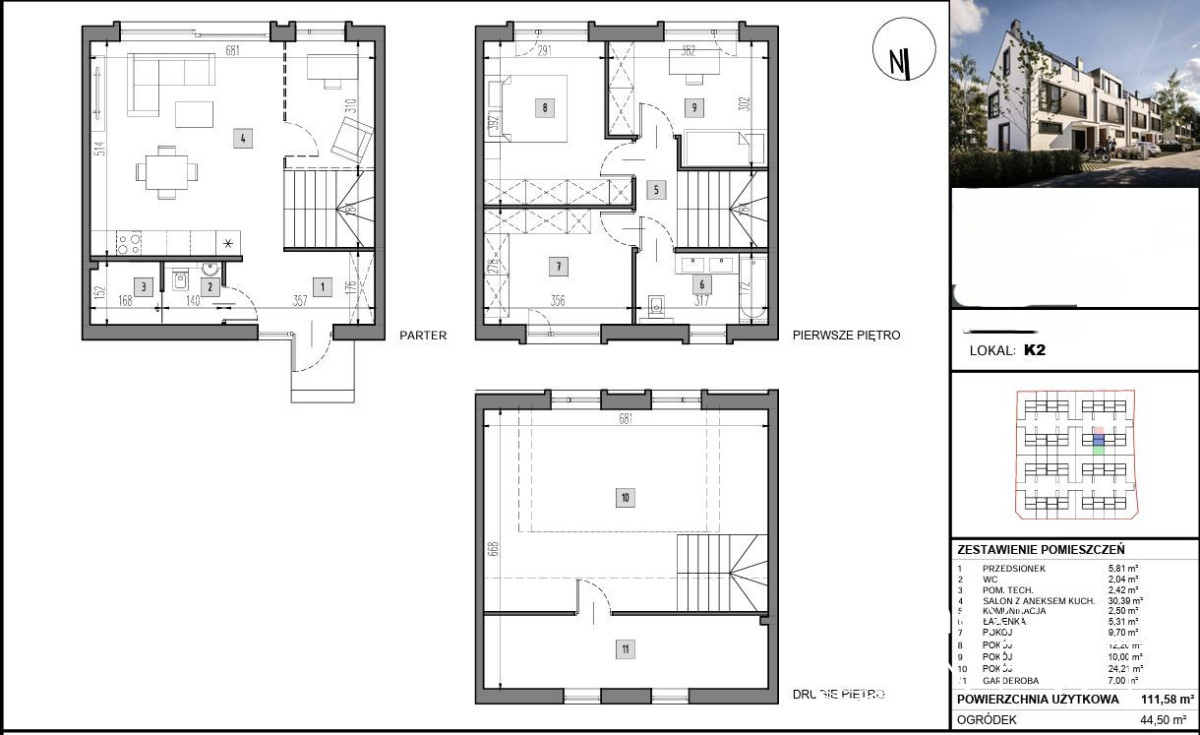 Przedmiotem sprzedaży jest 3 poziomowy lokal mieszkalny w stanie deweloperskim o powierzchni użytkowej 111,58 m2 z ogródkiem 44,5 m2, w budynku dwulokalowym w zabudowie bliźniaczej. Do lokalu przynależą 2 miejsca postojowe na podjeździe przed budynkiem. Osiedle położone jest w otoczeniu zabudowy jednorodzinnej w cichej okolicy.