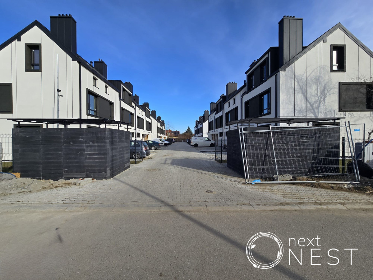 Dojścia i dojazdy do budynków wykonane będą z kostki betonowej lub płyt betonowych, miejsca postojowe wykończone materiałem typu ekokrata, ogrodzenie od strony ogródków z paneli systemowych w kolorze grafitowym, trawa z rolki.
