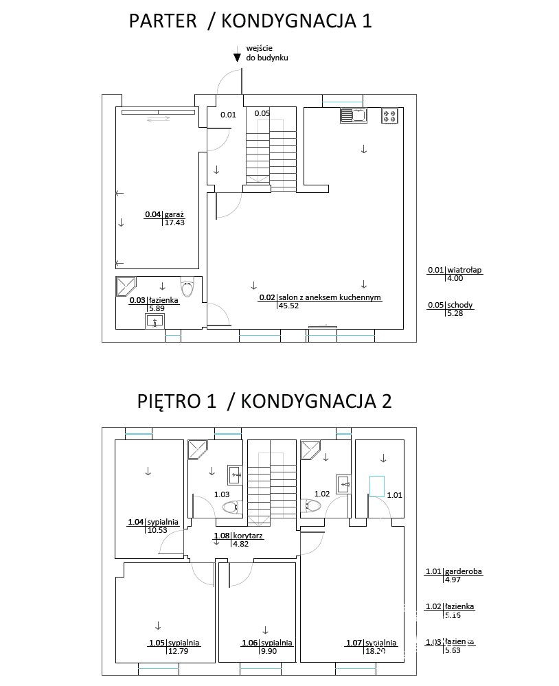 - piętro: 4 sypialnie w tym jedna z łazienką i garderobą, druga łazienka oraz korytarz.