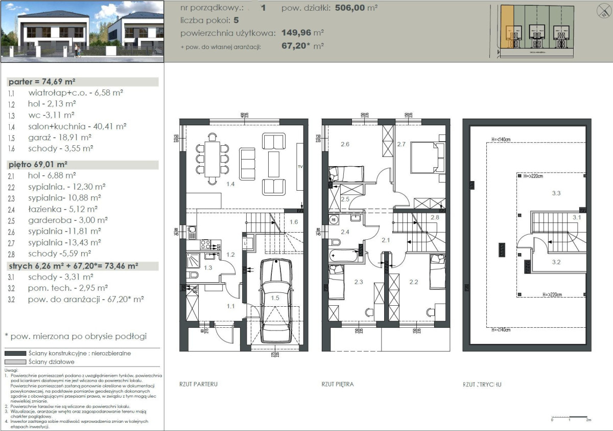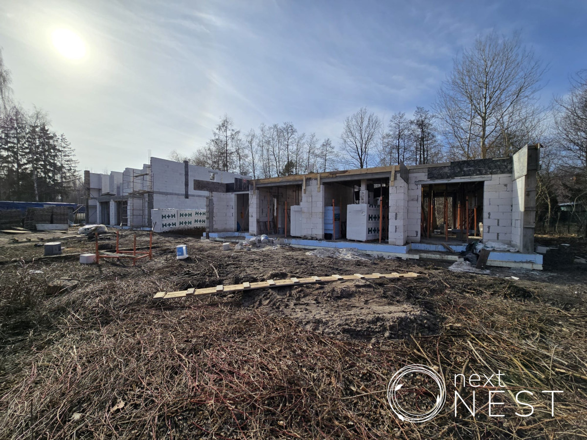 Przedmiotem sprzedaży jest lokal w stanie deweloperskim o powierzchni użytkowej 149,96 m2 w domu jednorodzinnym dwulokalowym (połowa domu) wraz z poddaszem o powierzchni 67,20 m2. Nieruchomość posadowiona na działce o powierzchni 506 m2 (do wyłącznej dyspozycji). Garaż jednostanowiskowy w bryle budynku oraz miejsce parkingowe przed budynkiem. Dojazd drogą asfaltową. W sprzedaży 6 lokali na działkach od 420 do 506 m2, wszystkie mają ogródki od południa, pomiędzy lokalami podwójna ściana z dylatacją jak w bliźniakach, oba stropy betonowe, schody betonowe również na poddasze, dachówka typu Brass Celtycka.