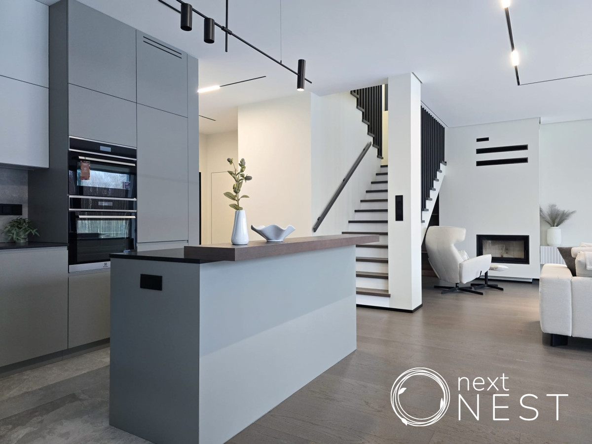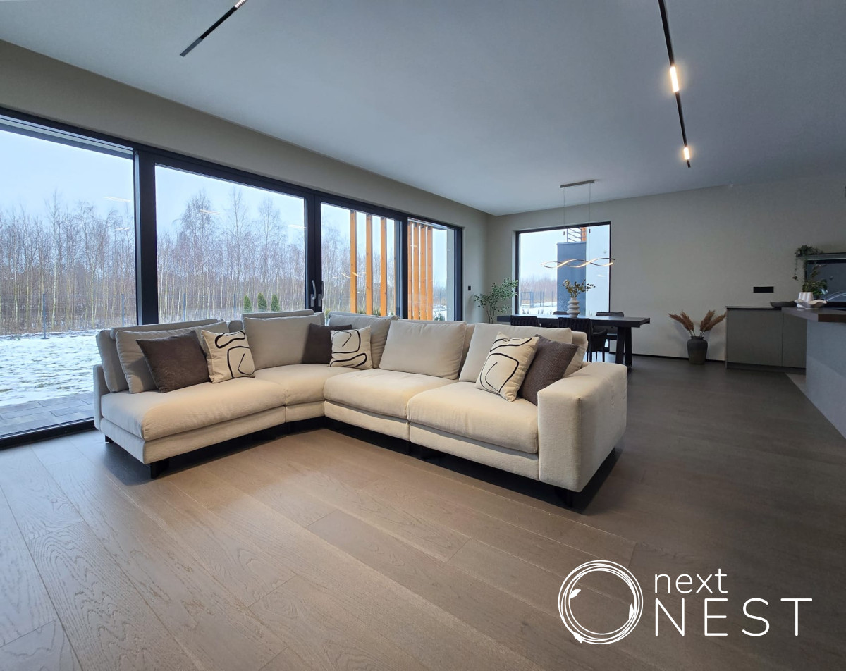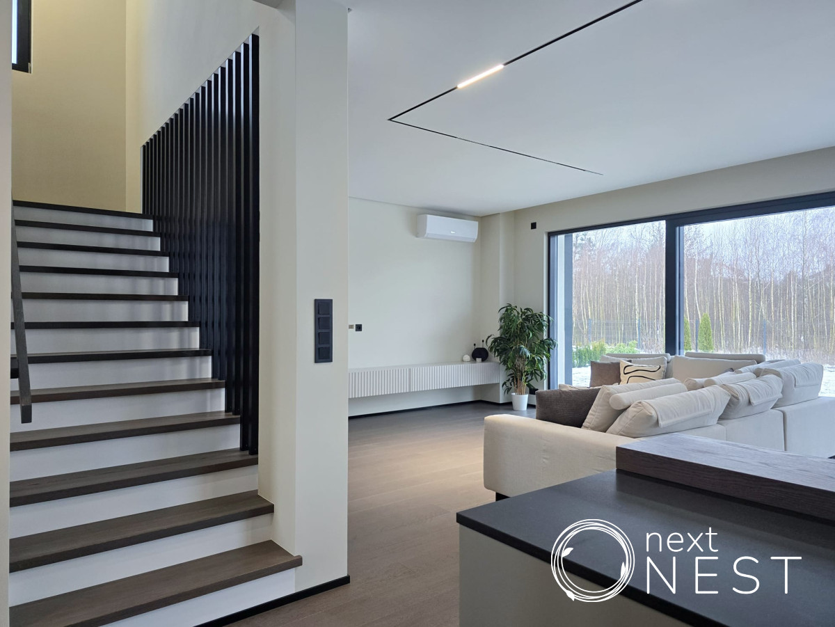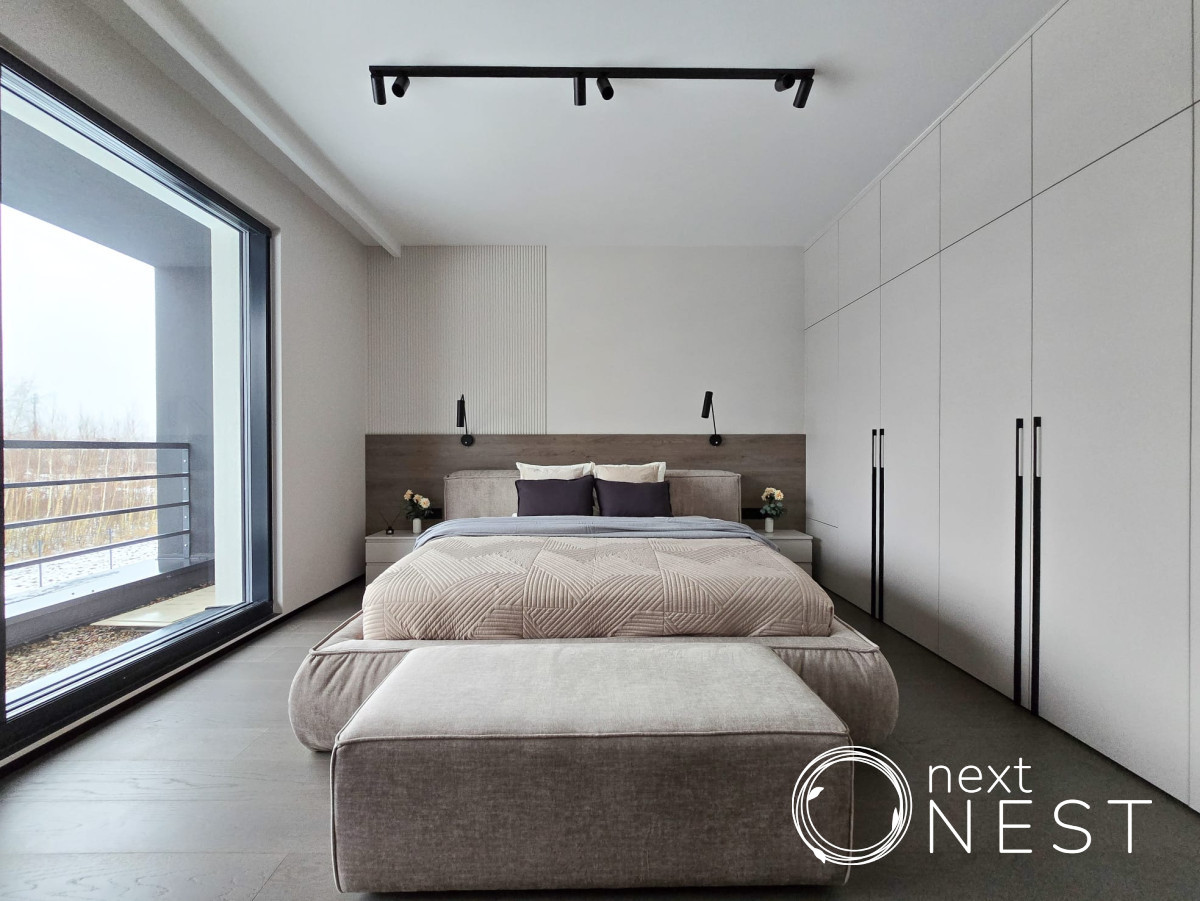 Piętro: trzy sypialnie, dwie łazienki, garderoba i hol oraz dwa balkony z przeszklonymi balustradami. W budynku zamontowane są duże okna aluminiowe panoramiczne. Budynki ogrzewane są pompą ciepła Hitachi i rozprowadzone jest w całym domu ogrzewanie podłogowe.