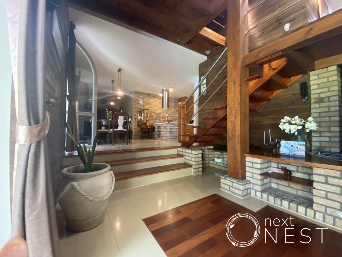 - wnętrze z elementami drewna i drewnianą antresolą z widokiem na salon