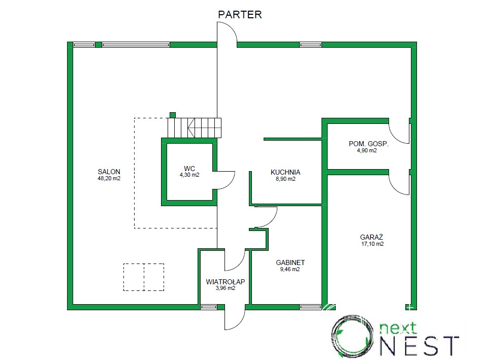 Przedmiotem wynajmu jest dom wolnostojący o powierzchni całkowitej 237 m2 (użytkowej 140 m2), z pięknym ogrodem na dużej działce 2 871 m2. Na parterze znajdują się: salon z kominkiem, jadalnia, kuchnia, gabinet, łazienka z prysznicem oraz hol. W bryle budynku wbudowany jest także garaż na jeden samochód, który obecnie przerobiony został na pomieszczenie gospodarcze ze zlewem, dodatkową lodówką i zamrażarką. Wyposażenie gospodarcze może zostać w cenie najmu.
