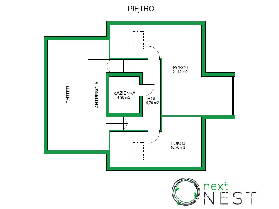 Na piętrze znajdują się: dwie sypialnie oraz łazienka z wanną.