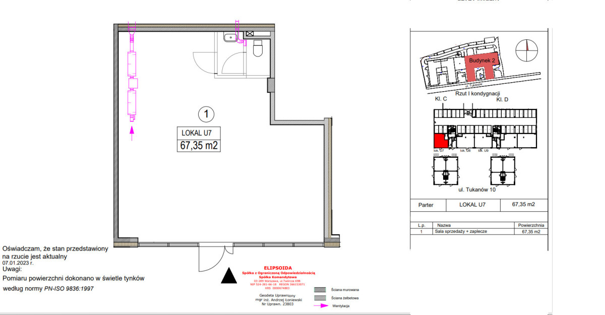 Przedmiotem najmu jest lokal usługowy o powierzchni 67,35 m2 położony na parterze budynku,
