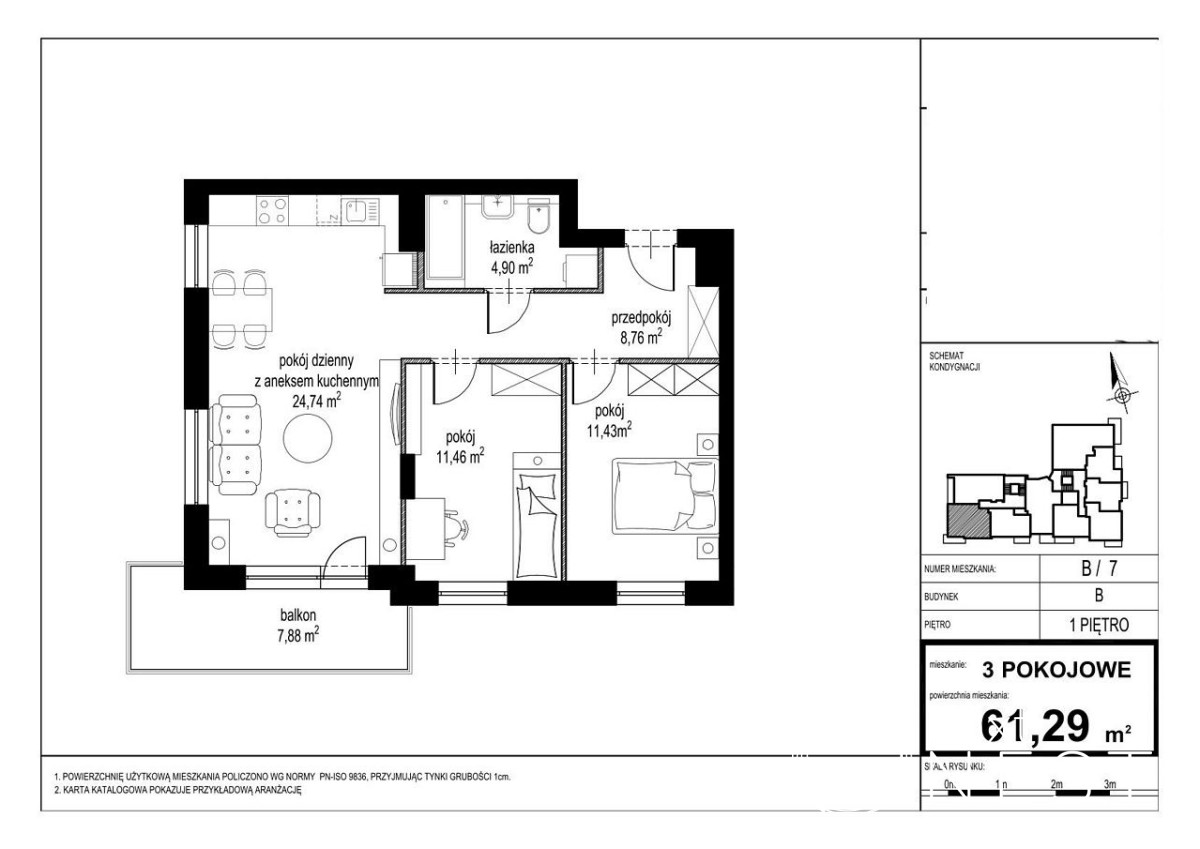 Mieszkanie usytuowane jest na I piętrze, ma powierzchnię 61,29 m2