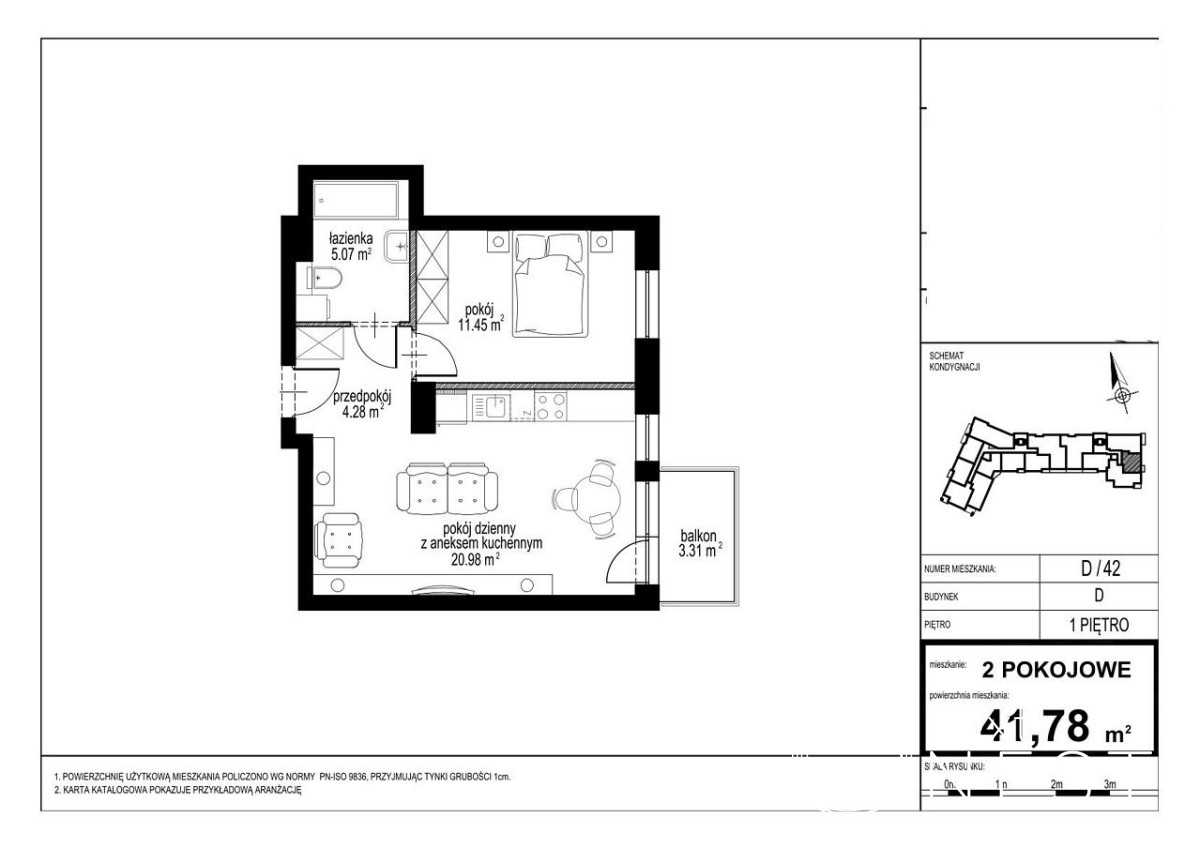 W skład mieszkania wchodzą: pokój z aneksem kuchennym, 2 sypialnia i łazienka z wc