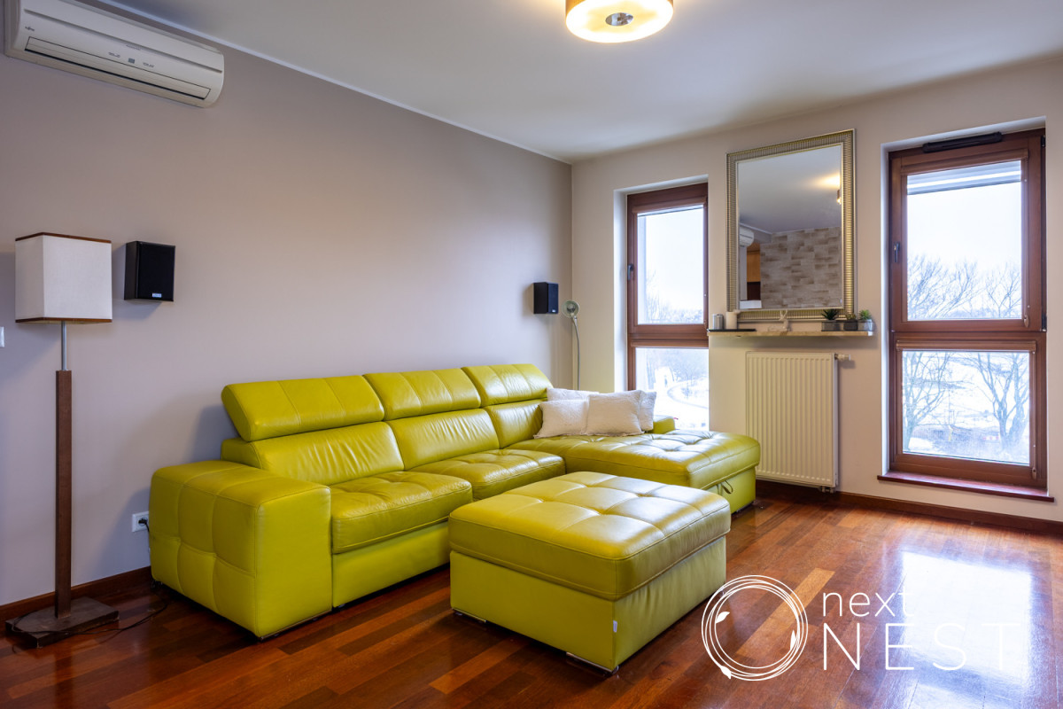 - przestronny salon z drewnianymi oknami oraz wyjściem na duży balkon,
