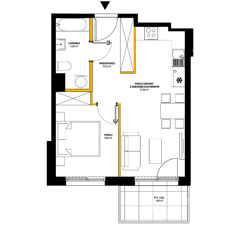 W skład mieszkania wchodzą: pokój z aneksem kuchennym, 1 sypialnia i 1 łazienka z wc.