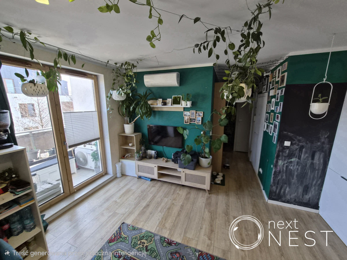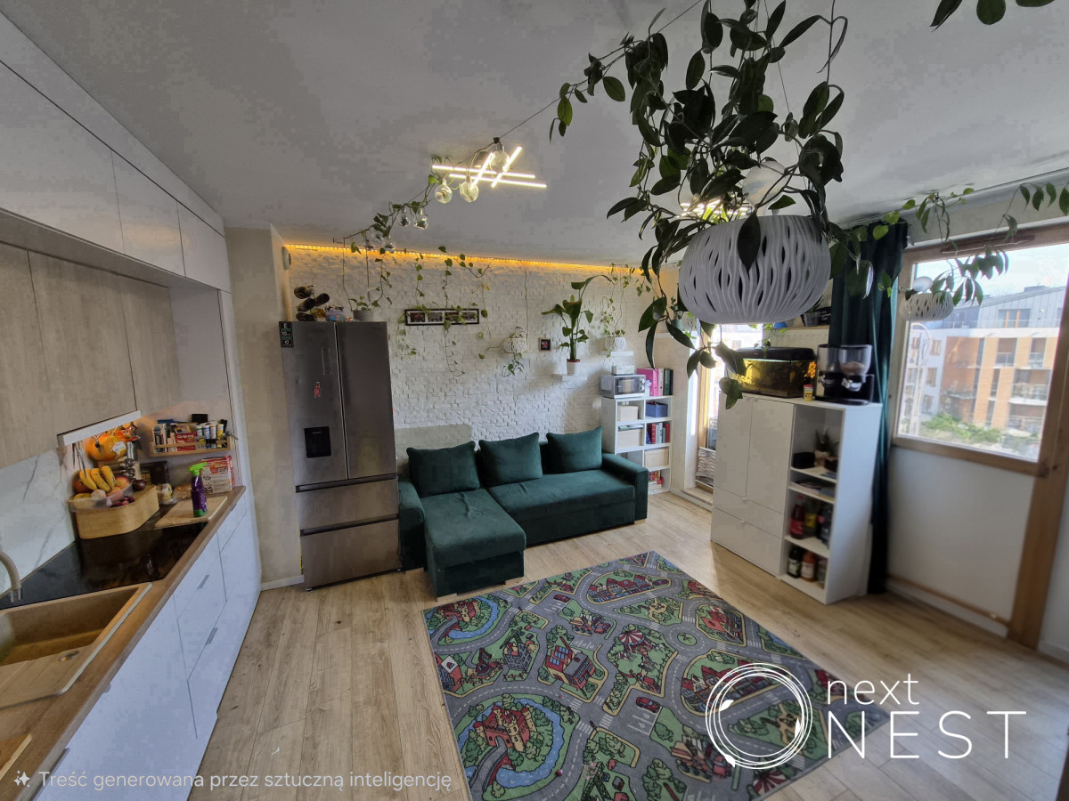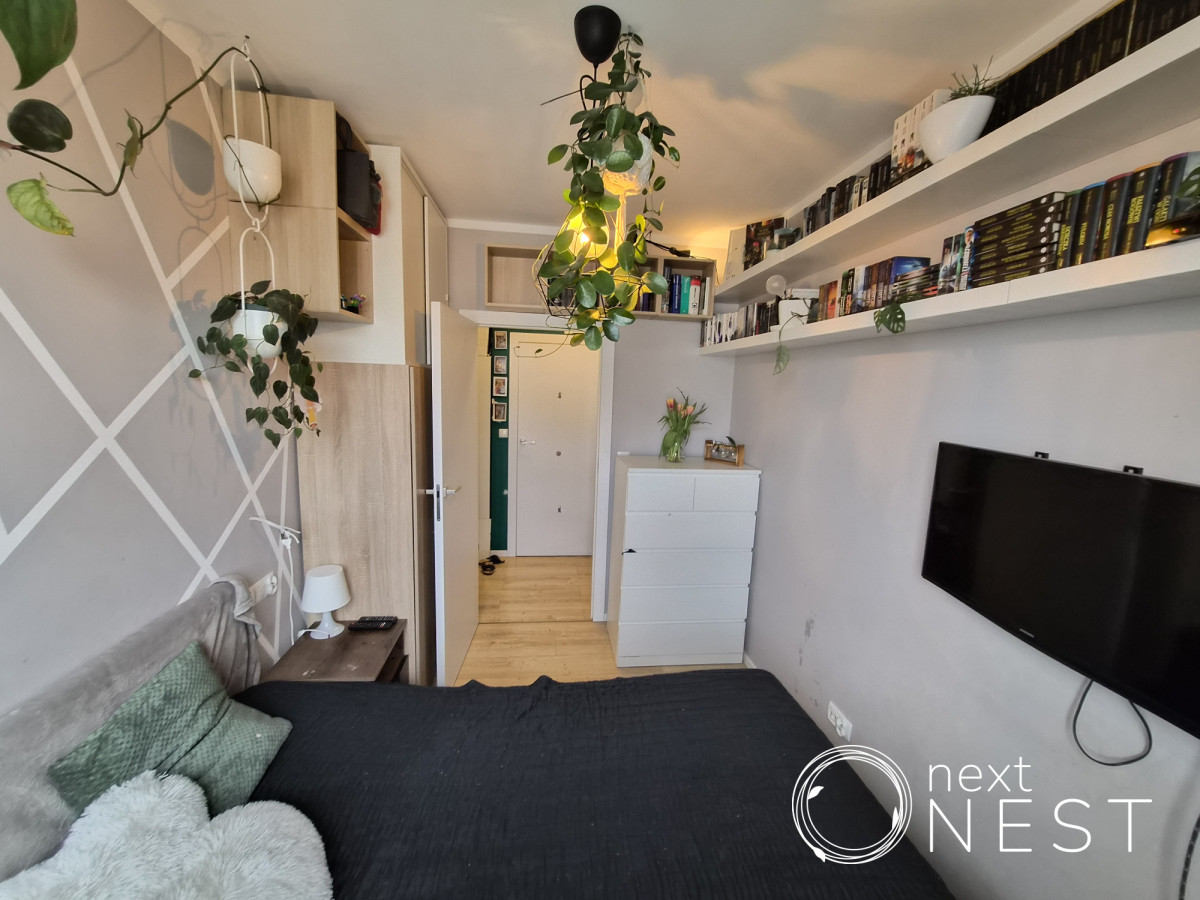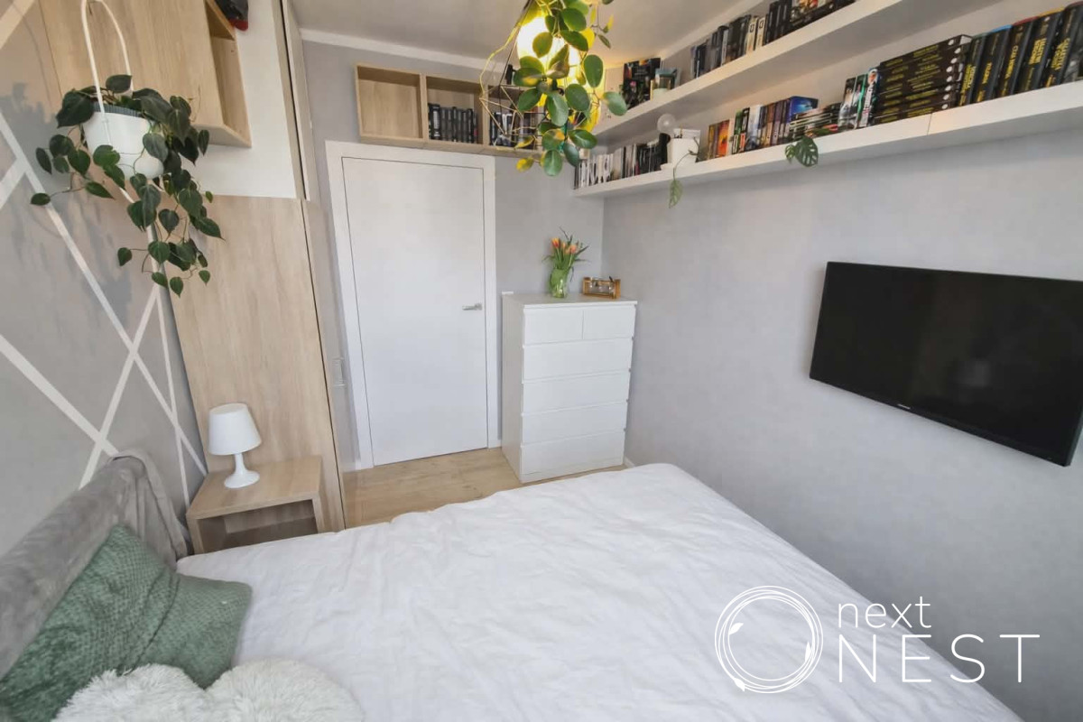 Mieszkanie składa się z salonu połączonego z kuchnią, dwóch sypialni, łazienki, oddzielnego wc i przedpokoju. Z salonu można wyjść na duży balkon.